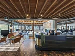The headquarters has several amenities including a multi-function lunch space, a yoga lounge, a library for quiet time, and phone booths for private conversation. A 'jazz bar' destination space has been inspired by Charlie "Bird" Parker and jazz. It represents a forest at night, with dark and moody finishes and furnishings, including a service area with a hand-hammered aged brass island and coffee bar.