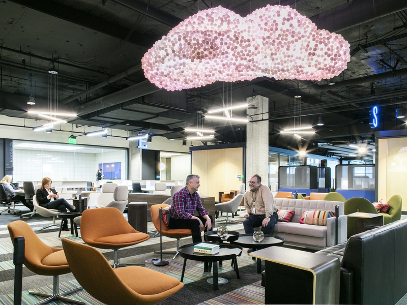 This workspace of the world's largest domain name provider is a fun and lively space offering open collaborative zones and quiet meeting rooms.