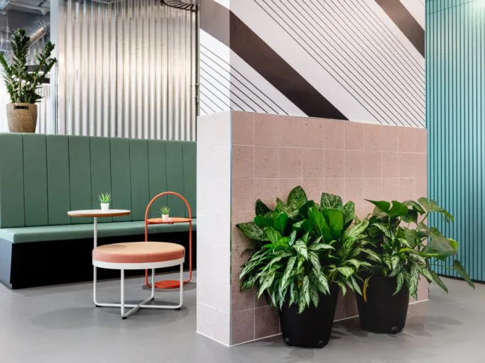 Pastel tones, and a playful use of textures have been incorporated into the reception area. Features such as velvet furniture, a stone reception desk, industrial cladding next to timber cladding and bespoke neon signage inspired by the vibrancy of Soho make the area stand out.