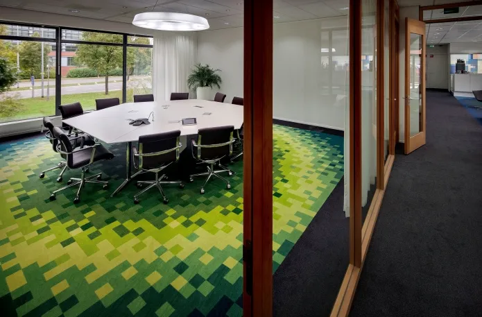 The meeting rooms have been styled with a focus on stimulating talent; pixelated green carpets adorn the entire floor, the various shades characterising growth, life and energy. Floor to ceiling windows invite natural light and offer employees a visual stimulus of nature outside. Embracing the biophilic theme, plants are used to garnish each room which further demonstrates that Liberty Global cares about nourishing the people that work there.