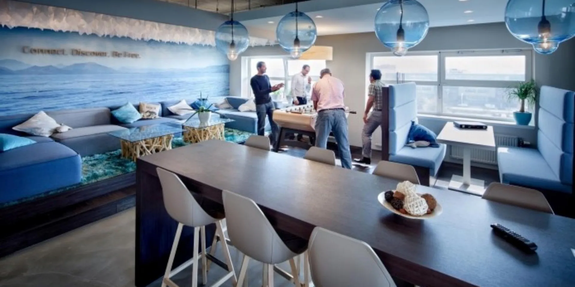 Evolution Design have succeeded in using colour to create empowering breakout areas – in the same space you have an oceanic view, dining table, secluded meeting pod and football table. The calming azure blue hues, known for their influential and productive connotations, allow this collaborative workspace to become multi-functional.