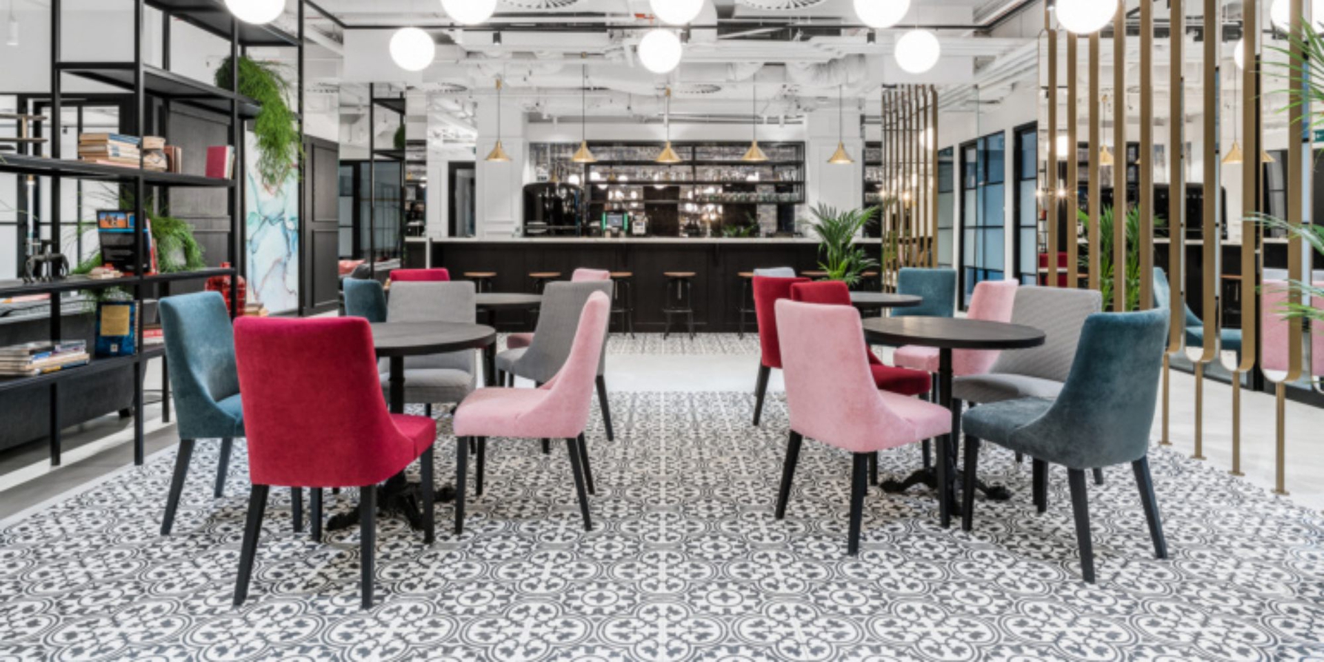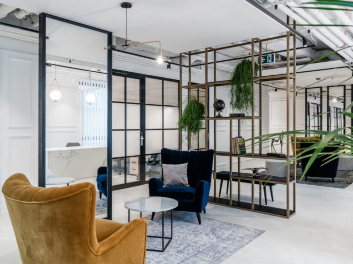 At the core of the design, is a classic and timeless combination of white, black and grey. This has been enriched with bolder colours throughout the space, combined with various fabrics, paintings and carpets. Muntins were added to glazing and doors, and the walls have been finished with stuccoworks, all of which differentiates the offices from other typical co-working spaces.