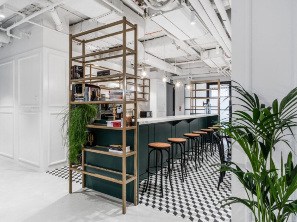 The reception area is spacious and bright, filled with elements of gold, marble and biophilia. At the heart of the office is the bar – a place for meetings and breakouts, as well as a more informal working environment. Also incorporated into the office design are comfortable conference halls, telephone booths, office rooms and open spaces for teamwork. These enable everyone to find the perfect place to work in this cosy, domestic workspace.