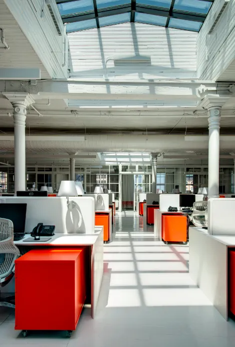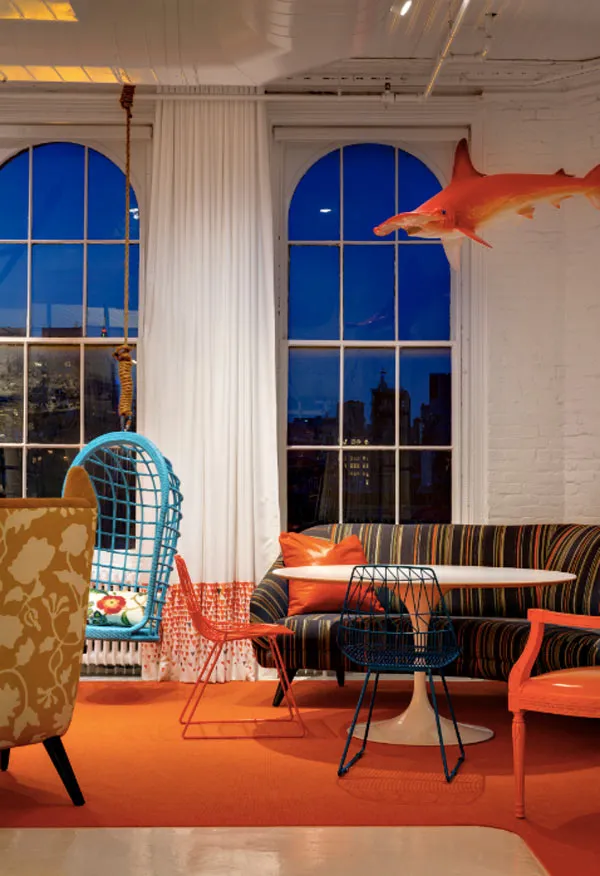 BHDM Design was hired to create the perfect office for Axiom, and we think you’ll agree that they definitely achieved this. They decided to retain and utilise the original architectural details of the loft and add a creative flair to the space by installing an 8-foot-long fibreglass shark over Axiom's work area in the companies iconic shade of orange.