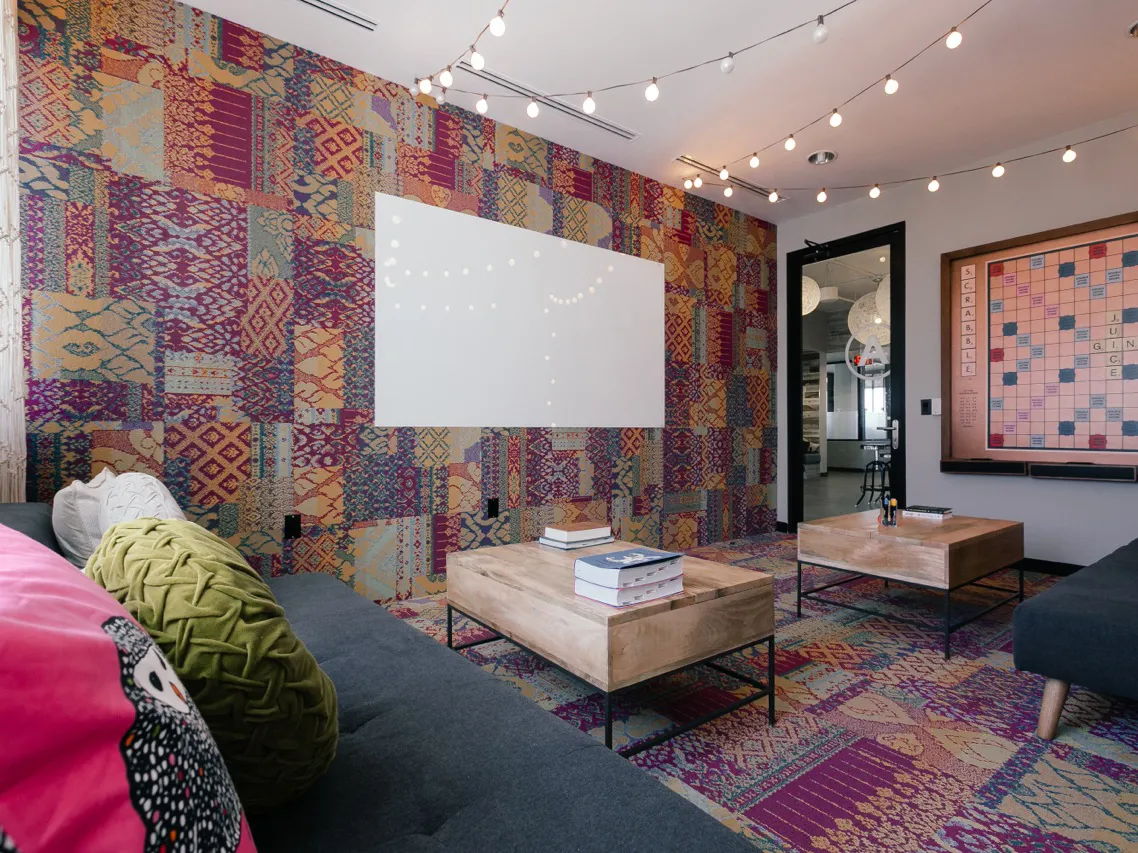 Let’s consider some of WeWork’s flagship US spaces: in Berkeley, California, Leung, Kolkovich and Britton came up with a psychedelic theme of carpets climbing the walls, tie-dye motifs and quotes from Timothy Leary, the Berkeley-based psychologist who popularised LSD. They’re always keen to preserve the history of a building so, in Manhattan’s SoHo and Meatpacking districts the original beams, exposed brickwork and old, worn-out floors were all left in place; in keeping with the “industrial design trend” that we’ve also been looking at recently.