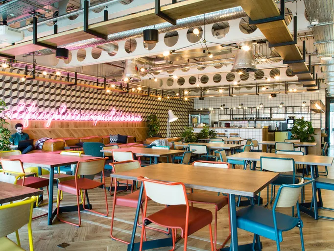 Coworking spaces have established their own aesthetic, and today all kinds of offices are designed to have a coworking feel. Some of the key features to look out for include brass fittings, glo-ball pendants or similar hanging lights, abundant planting and biophilia, artworks and graphics on the walls, and large breakout spaces with plenty of comfortable seating. As you can see, many elements of residential spaces are brought into the workplace: this is an age of coworking and co-living, and the two approaches are informing one another more than ever.