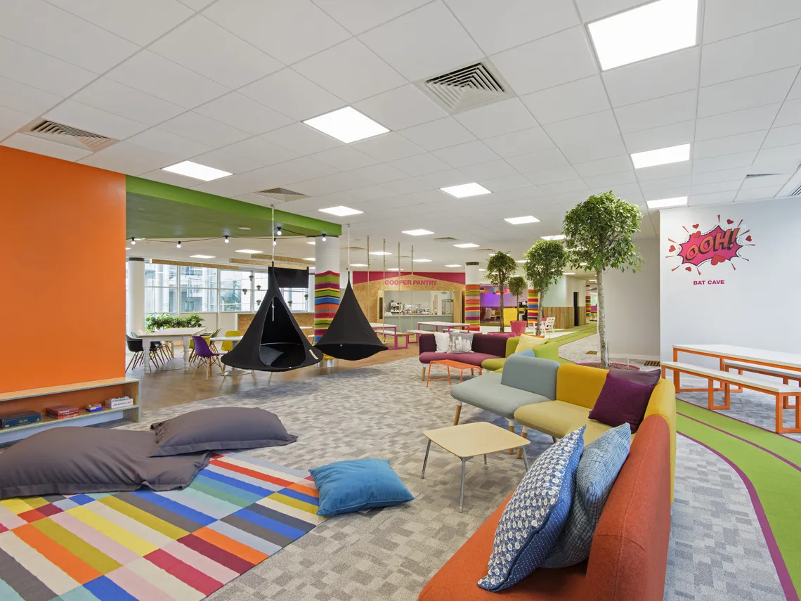 As the nature of work becomes more group-based, companies are abandoning the old model of one person to a desk, in favor of more shared groups spaces and more unassigned seating. This suits the agile, connected modern worker who spends most of their time on group work rather than solo work. Furthermore, even when it comes to solo work, many mobile workers don’t need a standard desk of their own and prefer working in shared social spaces. At PKF Cooper Parry’s playful offices, a wide variety of shared spaces are on offer, as are banks of HotLockers that allow employees to safely store personal belongings without having an assigned space. Workplaces like these, where employees share all spaces equally, encourage teamwork, socializing and collaborative spirit.