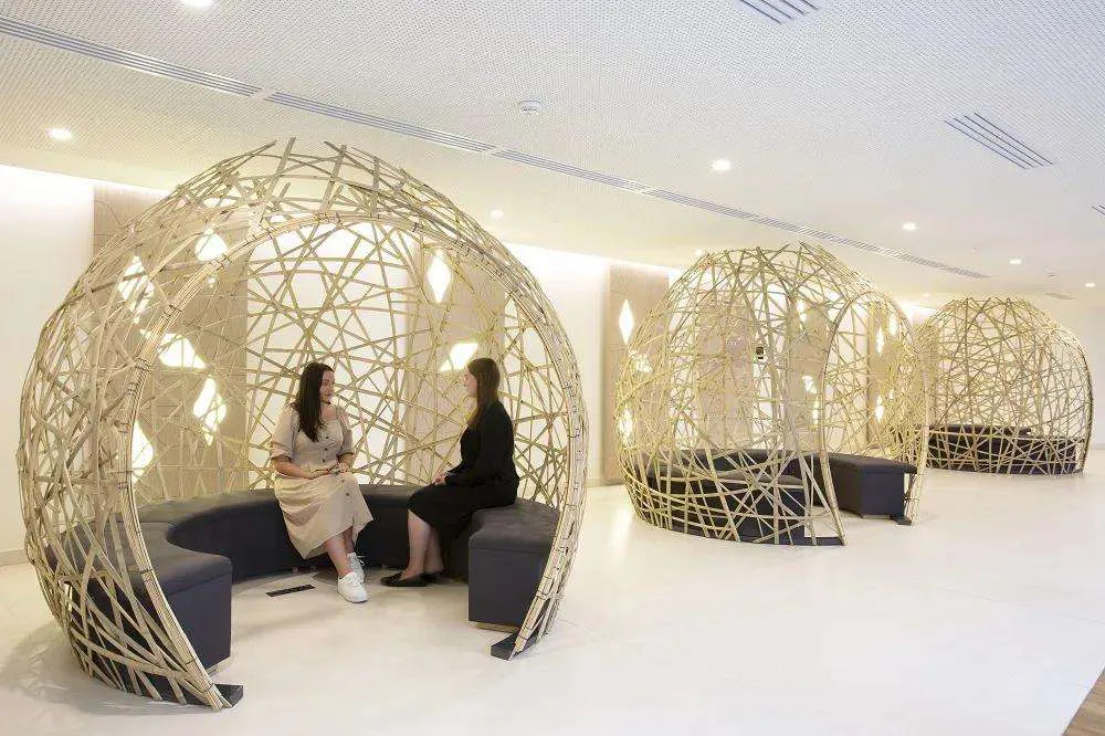 Companies can embrace an open and flexible office design by investing in zoning furniture, acting as versatile partitions that replace traditional, inflexible walls. The impact of this can be seen at the Woodland Trust’s Grantham offices, which uses our Palisades II space divider to offer a dynamic alternative to walls, avoiding the drawbacks of light-blocking and aesthetically uninspiring barriers. Maintaining designated areas for quiet, solo, or one-to-one work is still essential, and innovative solutions like Spacestor's Residence office pod and booth family address these needs without relying on traditional walls. Additionally, furniture such as Aeonica provides a reconfigurable space that serves as a visually appealing focal point in the office, seamlessly blending function and fashion.