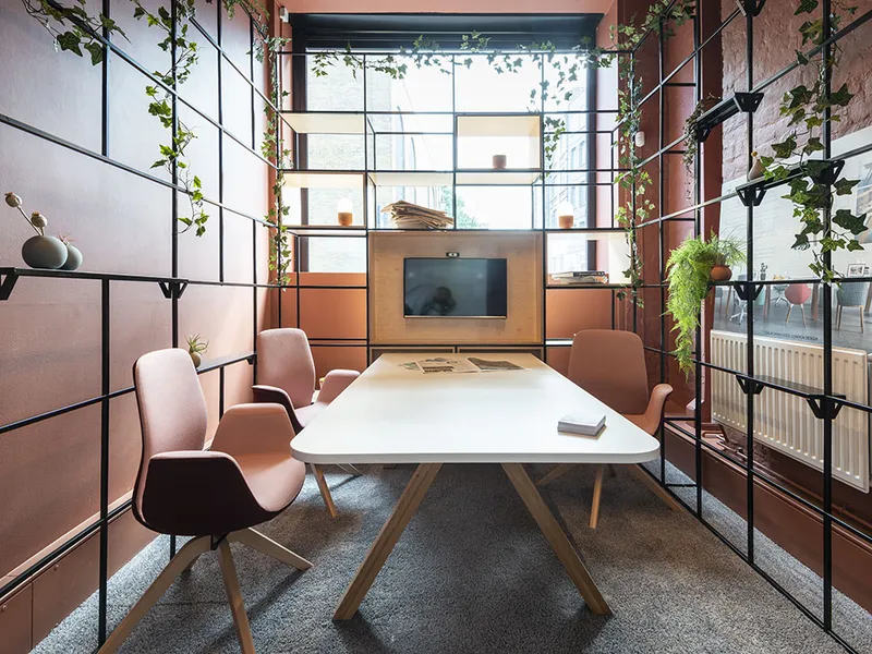 A warm and welcoming design with a biophillic material palette drawing on plywood, planting and muted upholstery tones