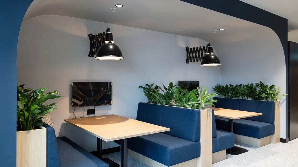Eden’s towering green facade, featuring Europe’s largest living wall, is a statement piece, home to over 350,000 plants that help absorb pollutants and boost biodiversity. Inside, TLT chose materials with similarly high sustainability credentials, like terrazzo worktops crafted from recycled plastics and upcycled lighting reclaimed from RAF bases and schools. Each element, from the recycled leather in the teapoints to the locally inspired artwork, was selected to reinforce the building’s eco-conscious ethos and socially sustainable heart.