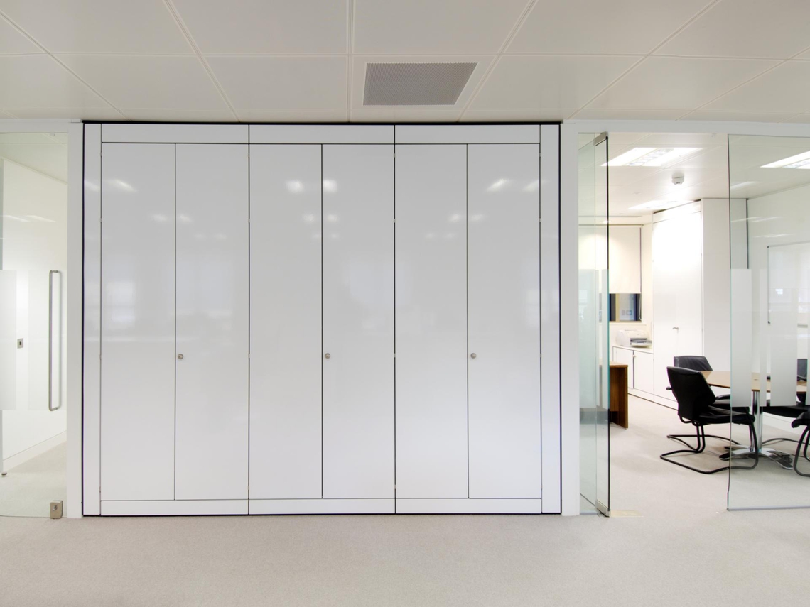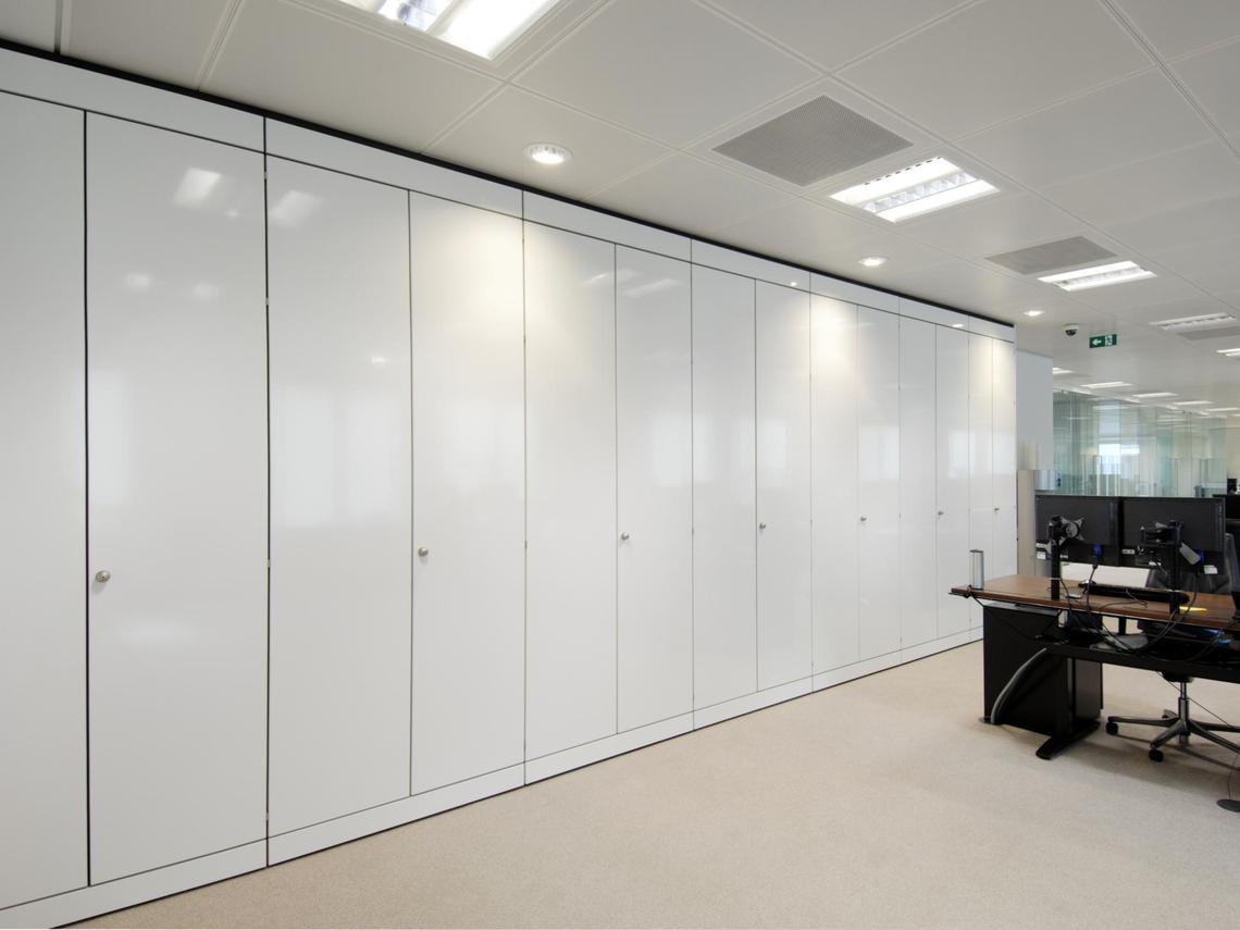 For this London-based asset management company, we were asked to install storage into open plan areas to divide rooms as well as provide maximum storage capacity. We also installed quality storage into all the managers’ offices. We used full-height Storagewall in white laminate, incorporating custom-made camera housing and cable pathways to a central equipment rack in order to neatly and efficiently store electrical equipment. For the units, all panel interfaces contained a consistent 7 mm shadow gap, superior to the industry standard. A clean, contemporary, high-end result was achieved.