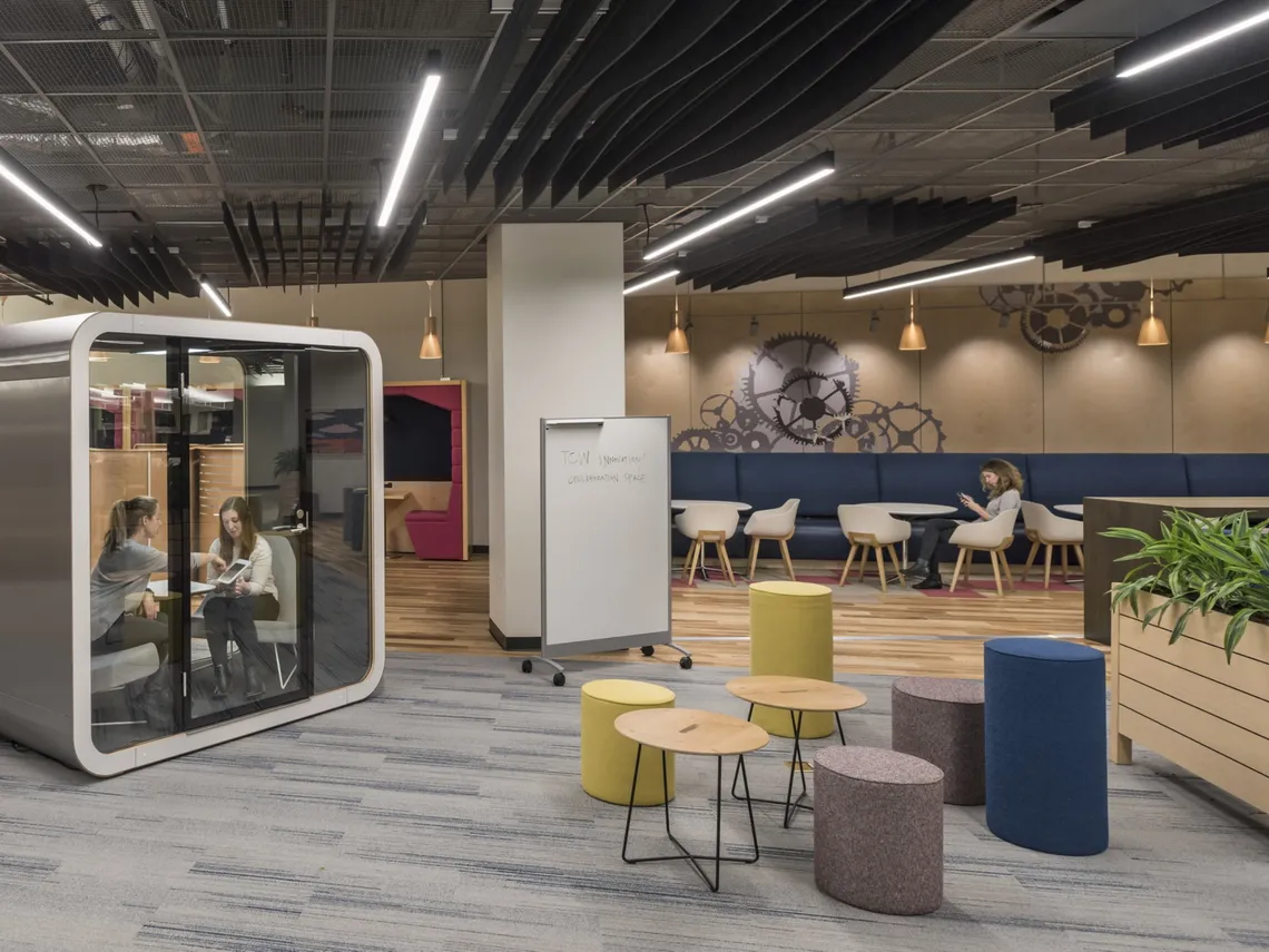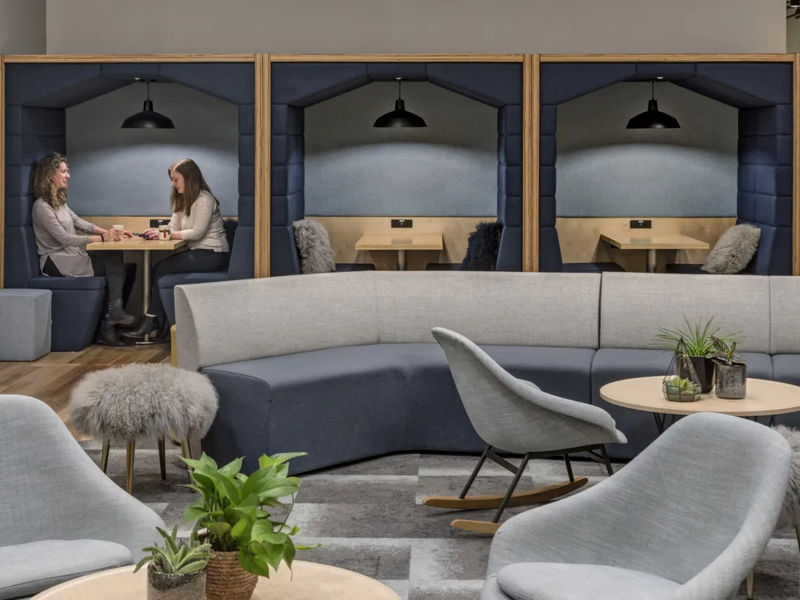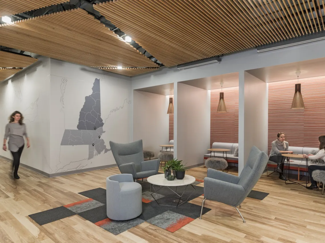A financial services client has recently worked with furniture dealers Officeworks, architects Jacobs, and Creative Office Pavilion to design their headquarters in Merrimack, New Hampshire. A beautiful space, luxurious and cosy in design with a serene feel.