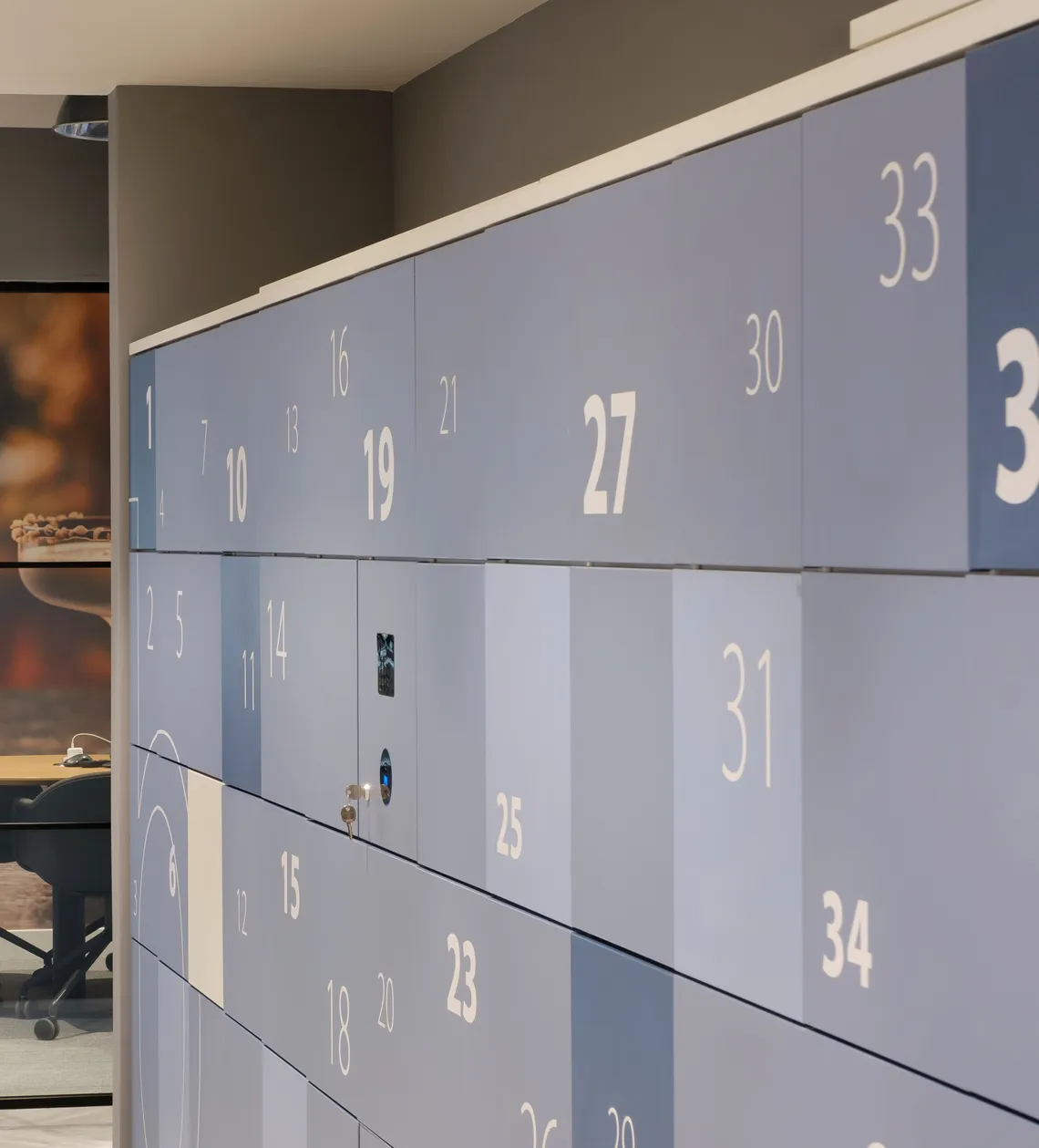 As part of this human-centric design, we were pleased to work with Source Developments to provide our tech-enabled, employee storage solution, HotLocker Agile system. In multiple banks over the three floors, the agile locker system allows the employees to assign themselves a locker each day, without needing to be tied to the same locker, at the same bank, or even on the same level, every day! The bespoke feel of the workplace continues on the lockers with the client choosing the colours, doors numbering and graphics that spread across the banks.