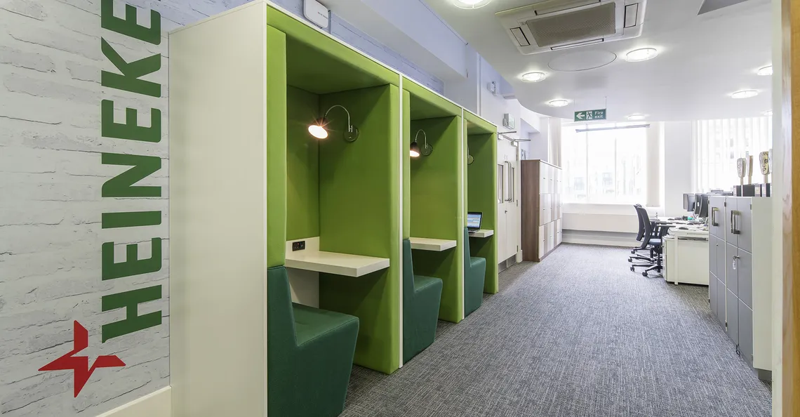 The most important change, they discovered, was that the design should be more agile and should offer a wider variety of smart working spaces to suit different tasks, personality types and approaches; some things are best done out in the open, whereas others require a little more privacy. As such, Spacestor provided a run of matching Phonebooths for focused individual work, as well as 4-seater and 6-seater Railway Carriages for smaller groups to use; all upholstered in harmonious green Heineken tones of course. The result is a more sociable, interactive office in which every member of staff can find their happy places.
