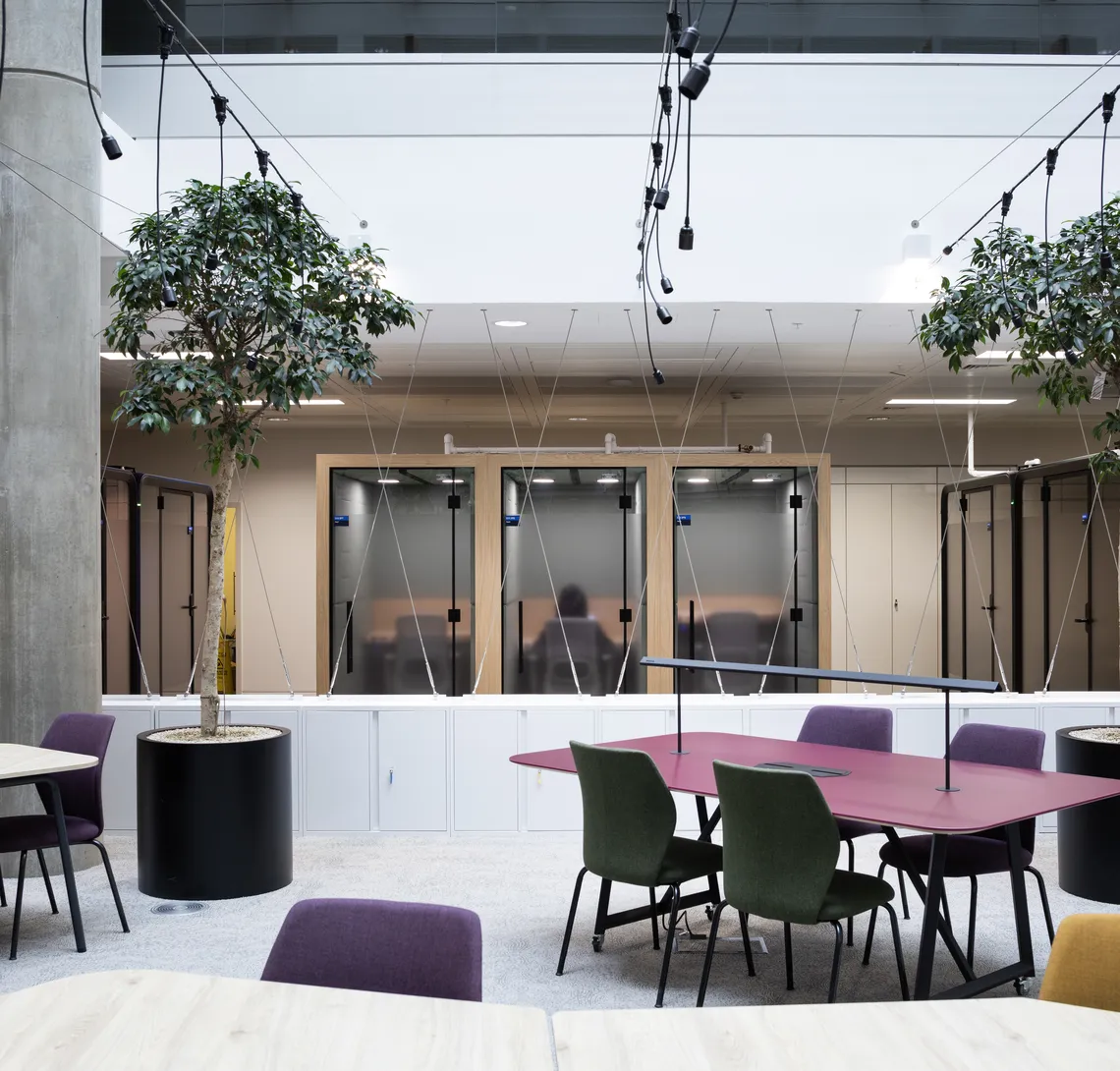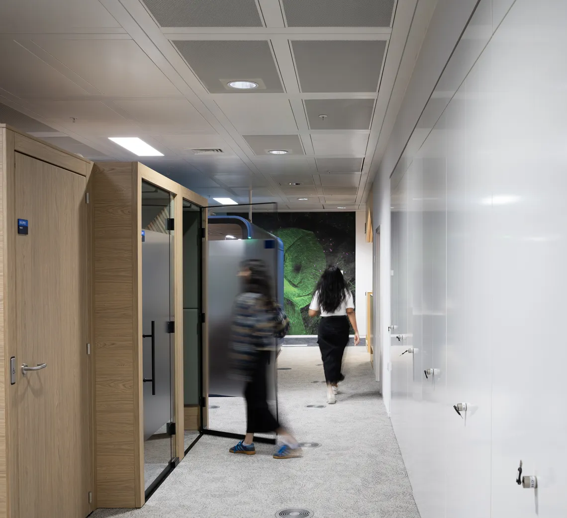 The floorplate includes a collaboration zone designed for smaller group sessions and agile teamwork. Alongside this, a dedicated pod hub provides private, tech-enabled spaces through Spacestor’s Portals Connect and Residence Connect booths. These create enclosed settings for video calls and focus work, reducing noise across the office. The Residence Connect booths are fully accessible, equipped with push-button entry so they can be used by everyone, designed and built from the ground up to enhance video calls.