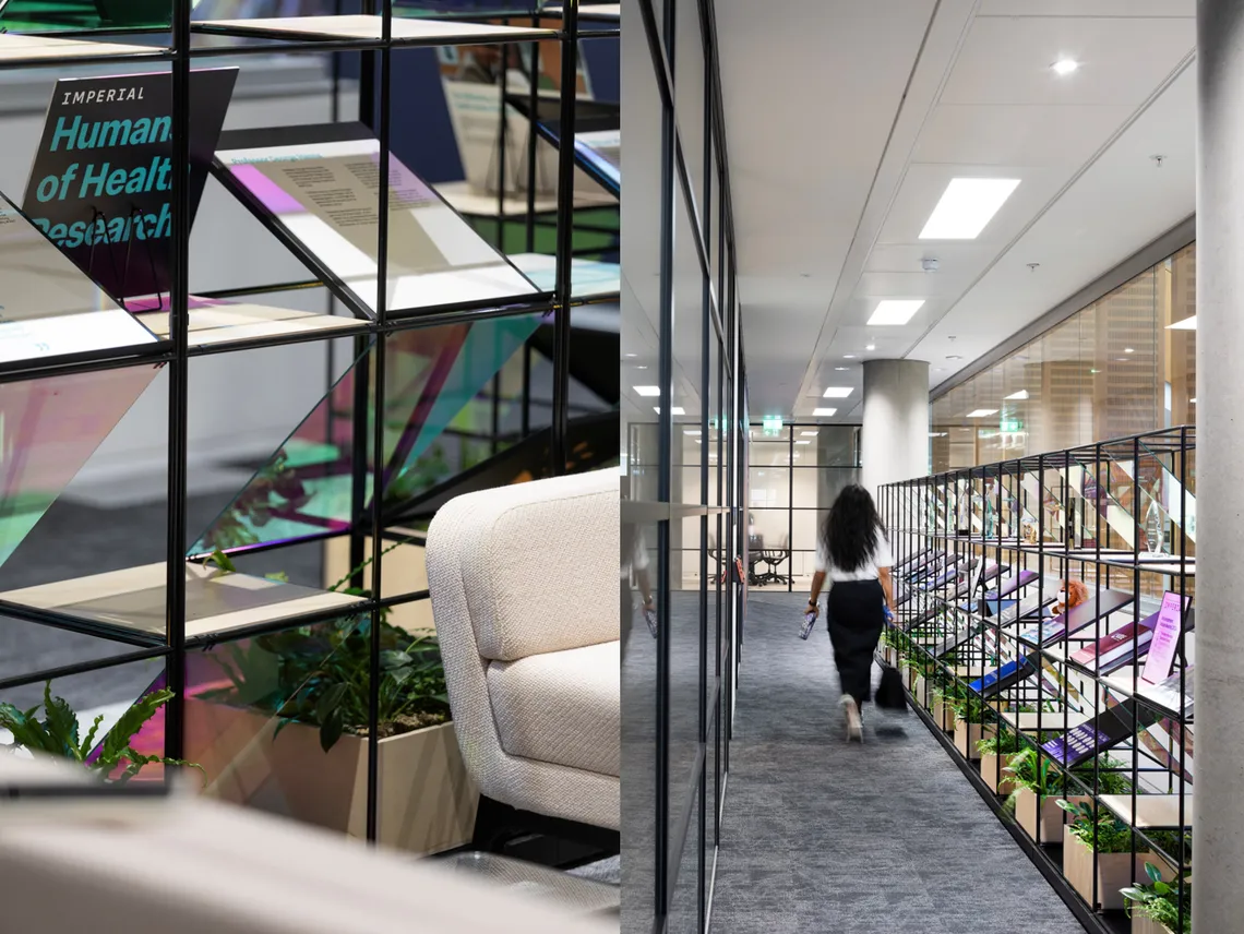 We were also pleased to bring Palisades Grid to the project, introducing definition and structure and acting as both a divider and display system. Accessorised with dichroic glass panels, it adds a shifting spectrum of colour and light that reflects the scientific energy of Imperial College London while keeping spaces open and connected. The product has been used to display infographics and images, giving a nod to the work being done on campus.
