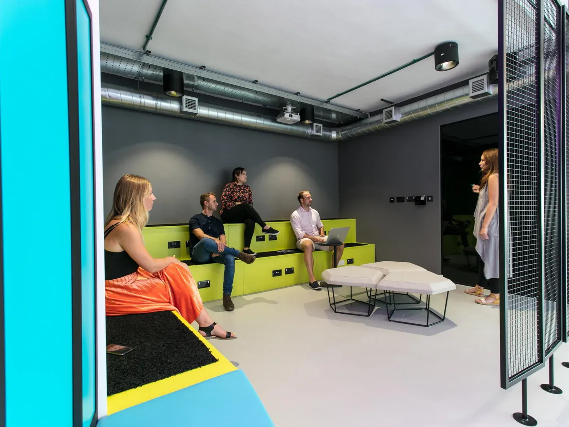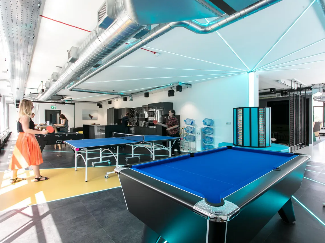 As the first fit-out at Programme, Bristol city centre’s landmark business development, NEX’s new 8,000 square foot office leads the way for the region’s booming tech industry. The specialists in cost-consultancy and risk management hired workplace designers Interaction to build them a post-industrial space full of high-tech design features: from colourful LED lighting, to a breakout games zone, to a shared seating area designed to look like a supercomputer. The result? A space that’s dazzling for clients and highly versatile to suit every employee’s needs.