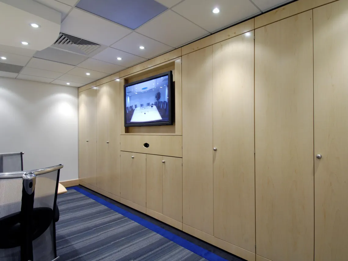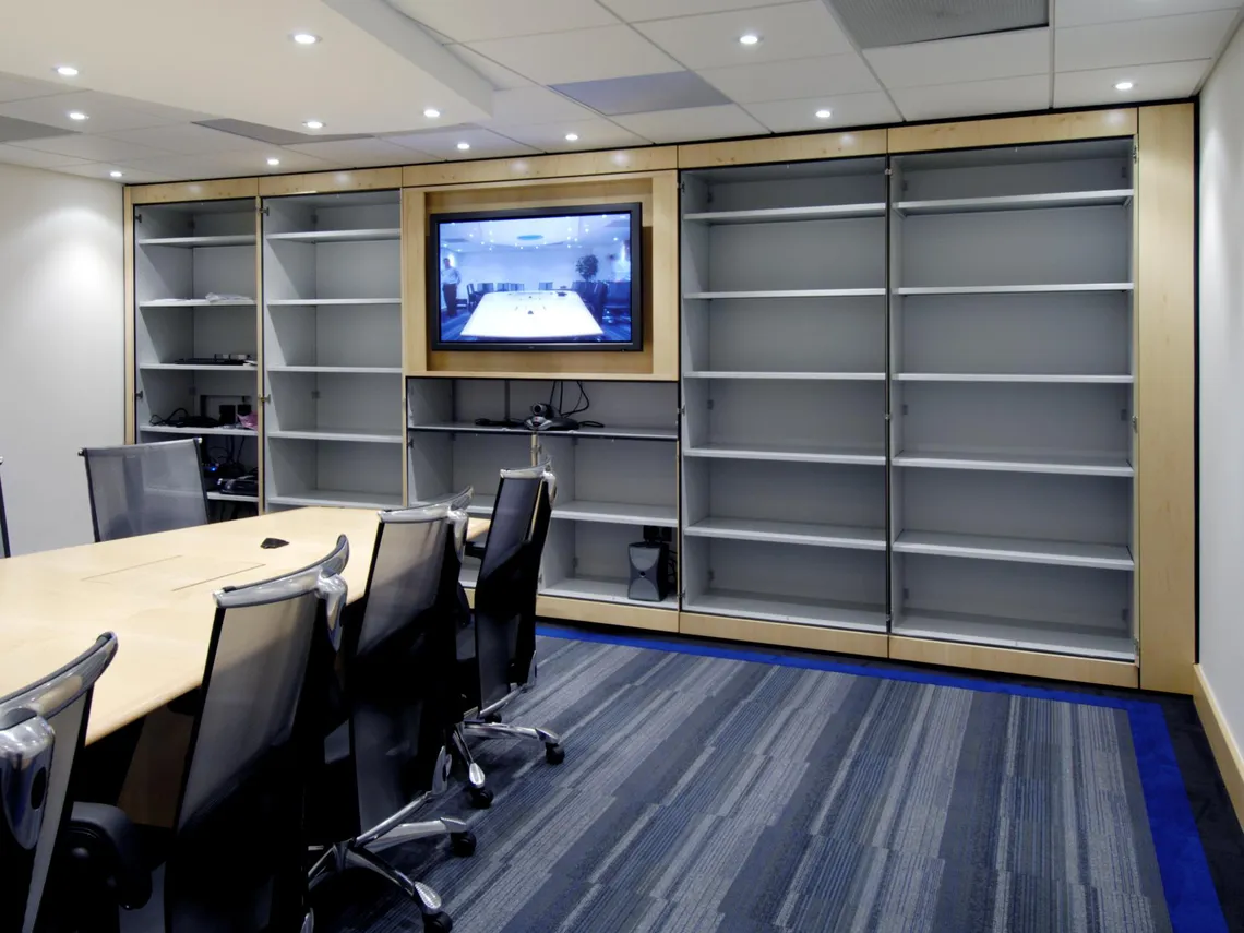 Interconnecting modules provide storage with discreetly incorporated video and teleconference facilities. For this project, we supplied storage for a leading manufacturer of wireless communication products. They wanted to incorporate video and teleconference facilities discreetly into the storage systems.