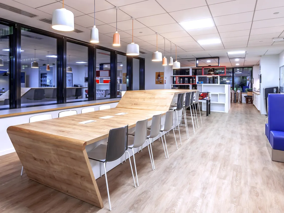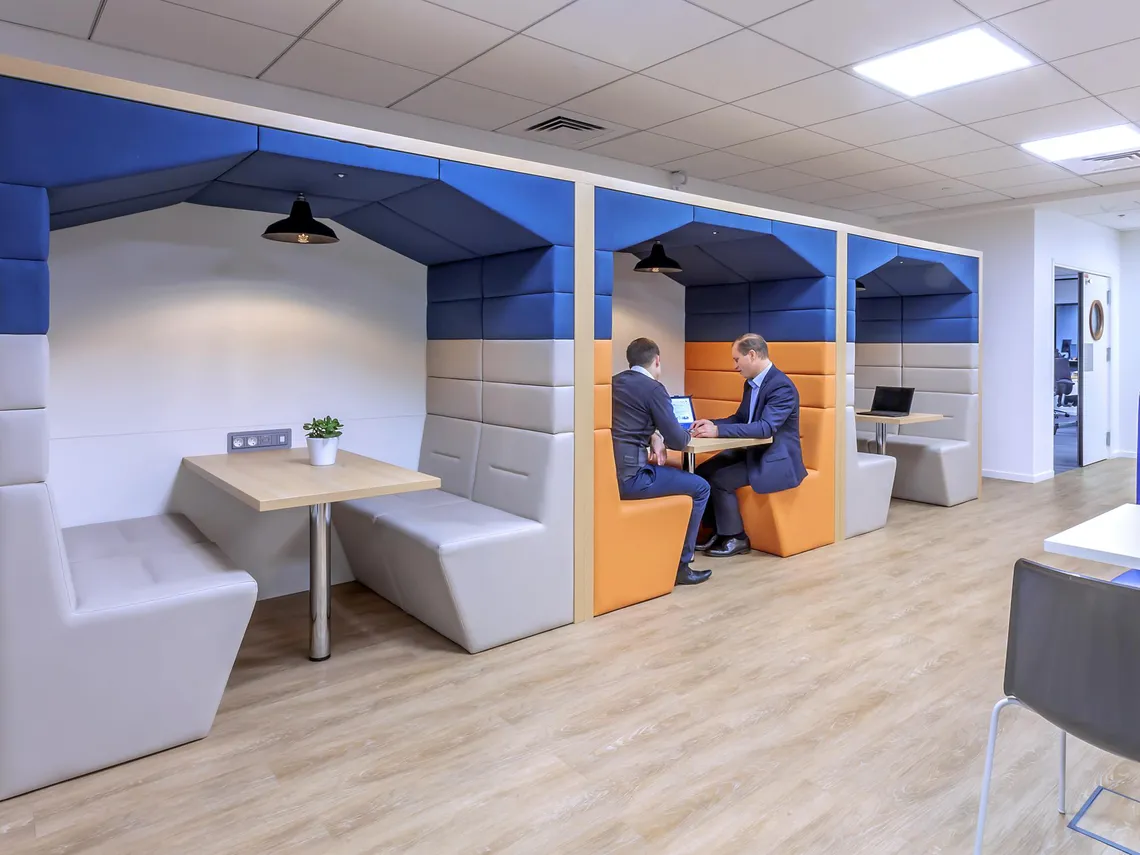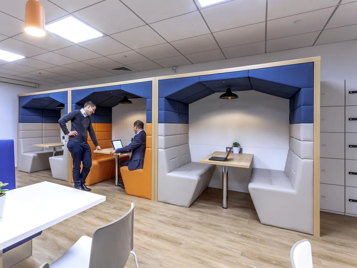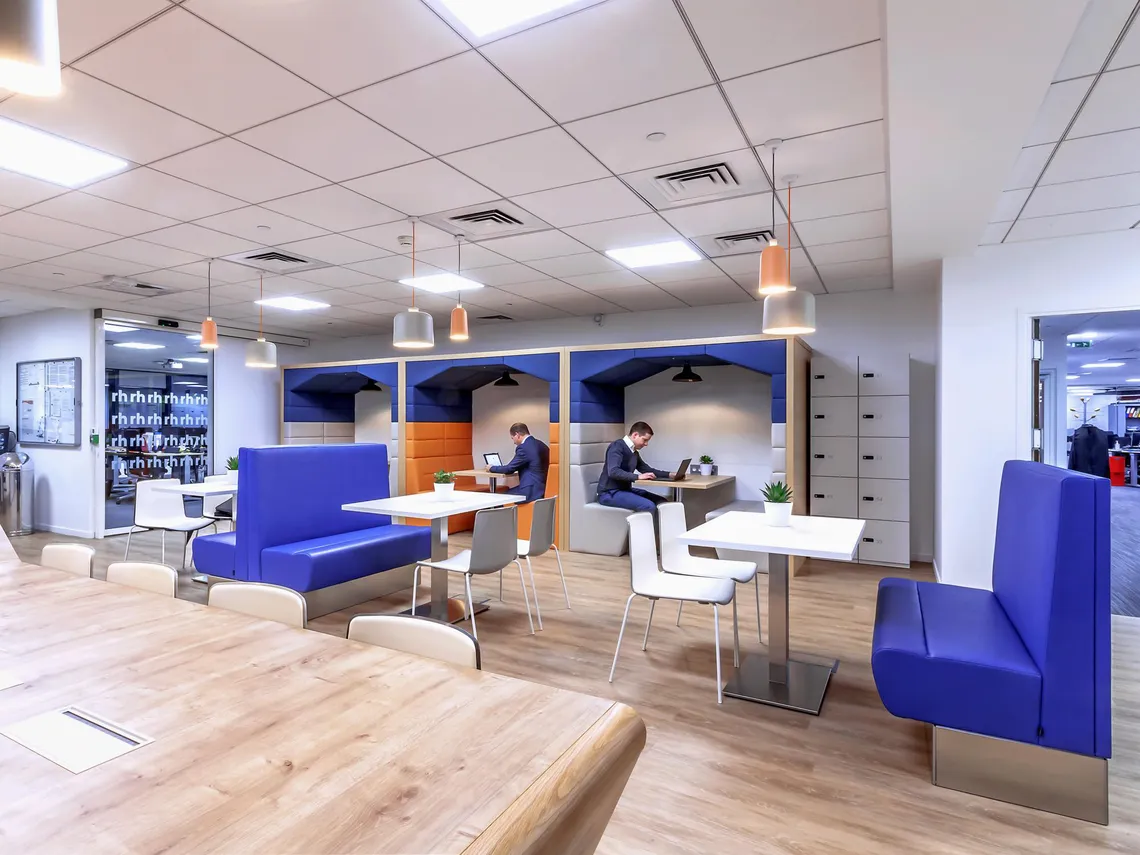 Arch Design placed a cafeteria at the heart of the space, where it could serve as both a relaxation and a meeting area, and surrounded it with a variety of meeting spaces suited to small working groups. As such, Spacestor were happy to install a run of three Railway Carriage meeting pods upholstered in blue with alternating light grey or orange; and rather harmoniously, the square arches of these Railway Carriages mirror the form of the famous Grande Arche de la Défense that has long been the symbol of the neighbourhood. Furthermore, we also provided a tower of HotLockers for employees to store their personal effects in, contributing to the making of a nice, welcoming workplace that can adapt to the needs of Robert Half International’s staff.