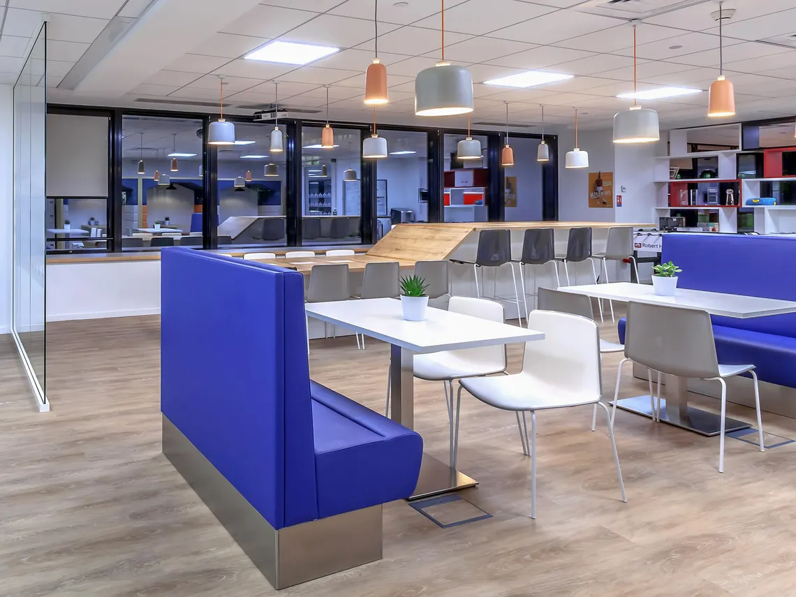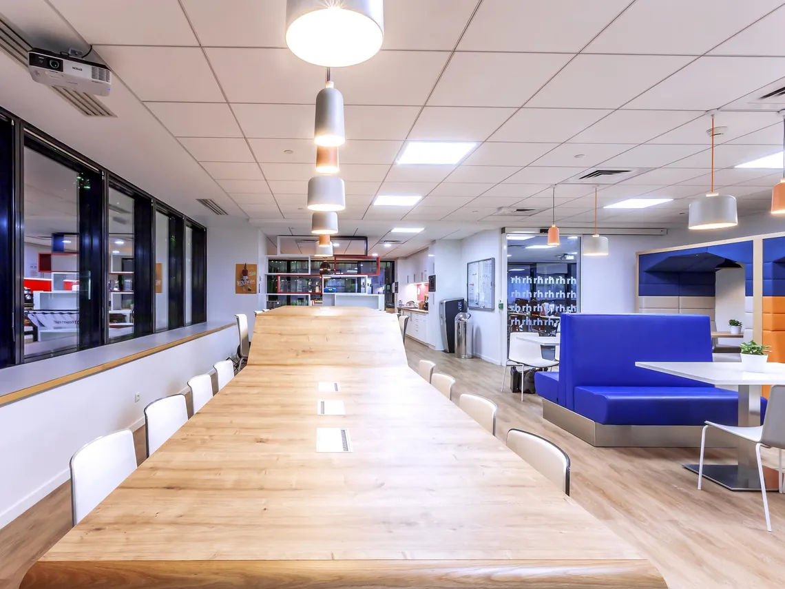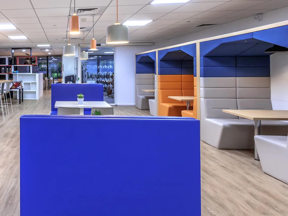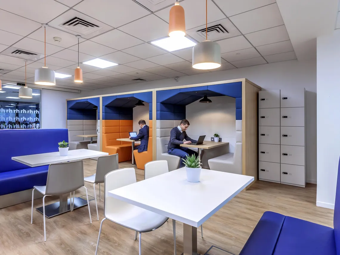 Arch Design placed a cafeteria at the heart of the space, where it could serve as both a relaxation and a meeting area, and surrounded it with a variety of meeting spaces suited to small working groups. As such, Spacestor were happy to install a run of three Railway Carriage meeting pods upholstered in blue with alternating light grey or orange; and rather harmoniously, the square arches of these Railway Carriages mirror the form of the famous Grande Arche de la Défense that has long been the symbol of the neighbourhood. Furthermore, we also provided a tower of HotLockers for employees to store their personal effects in, contributing to the making of a nice, welcoming workplace that can adapt to the needs of Robert Half International’s staff.