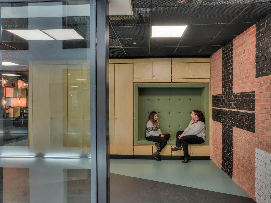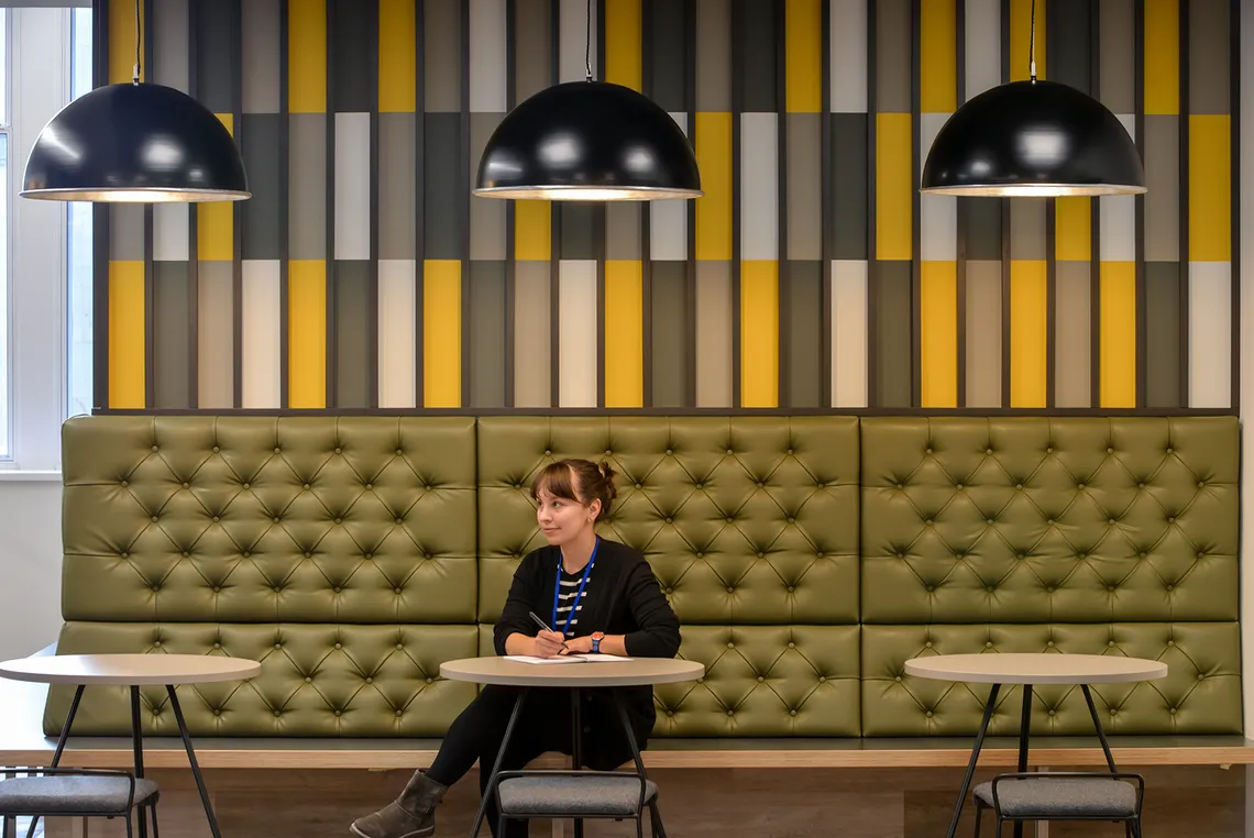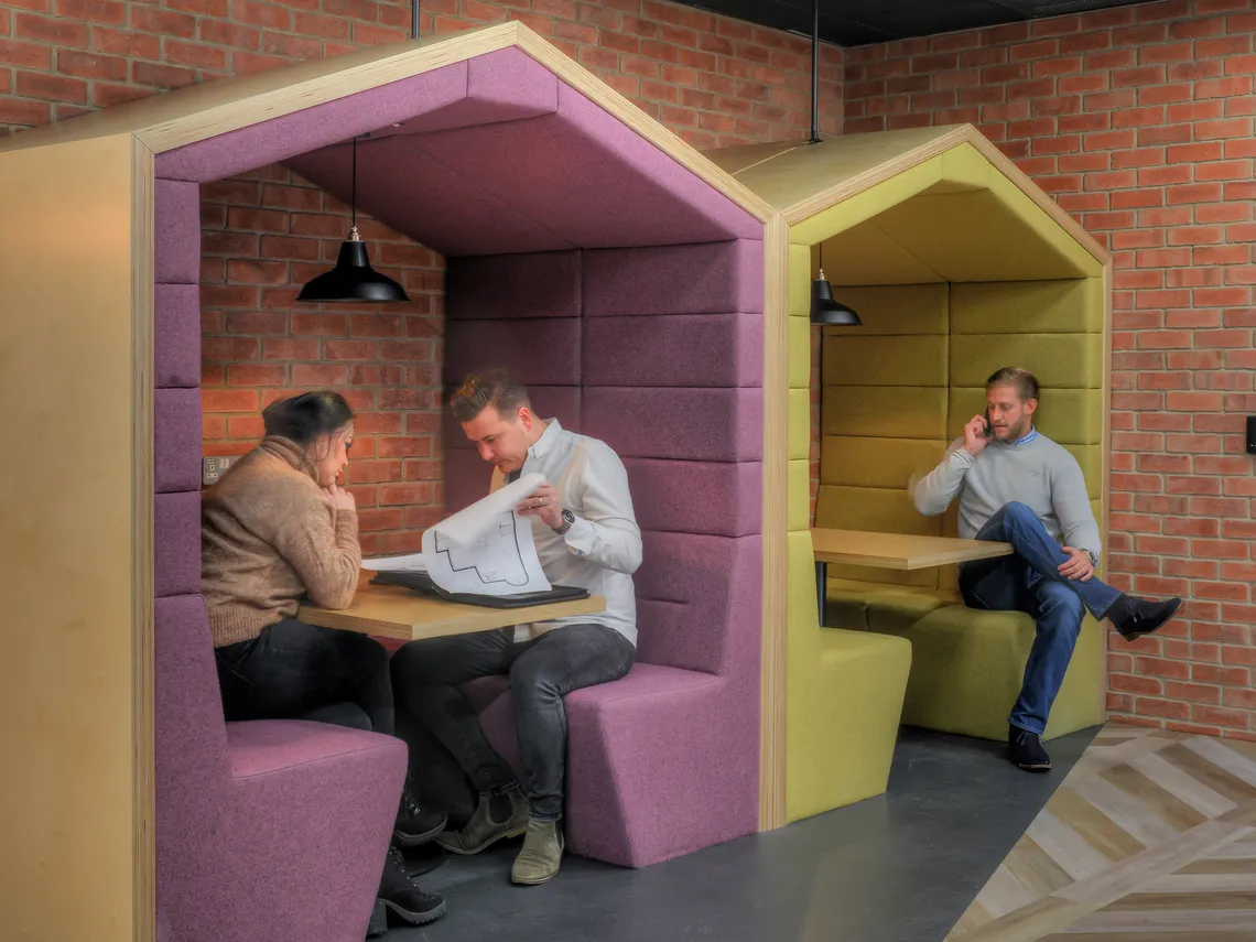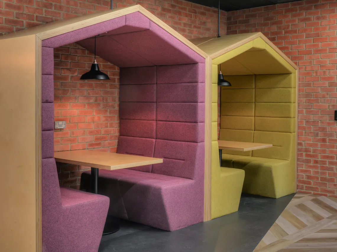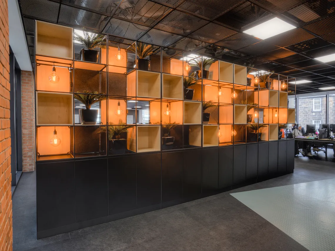 McCaffery’s designs were built by Scotwood Interiors and furniture experts at Bureau. Jim Scott, managing director of Scotwood Interiors, describes how, “From breakout areas, to the meeting and training rooms, to the open-plan space, every room and area is different.” Here at Spacestor, we were pleased to supply some of the key architecture making such variety possible: a warm Palisades Grid zone divider filled with hanging halogen lights and plants, a wood-finish Storagewall run with a light green, recessed Snugglestor seating area, and two pairs of Railway Carriage meeting pods with pitched roofs; perfect places in which to plan the future of travel.
