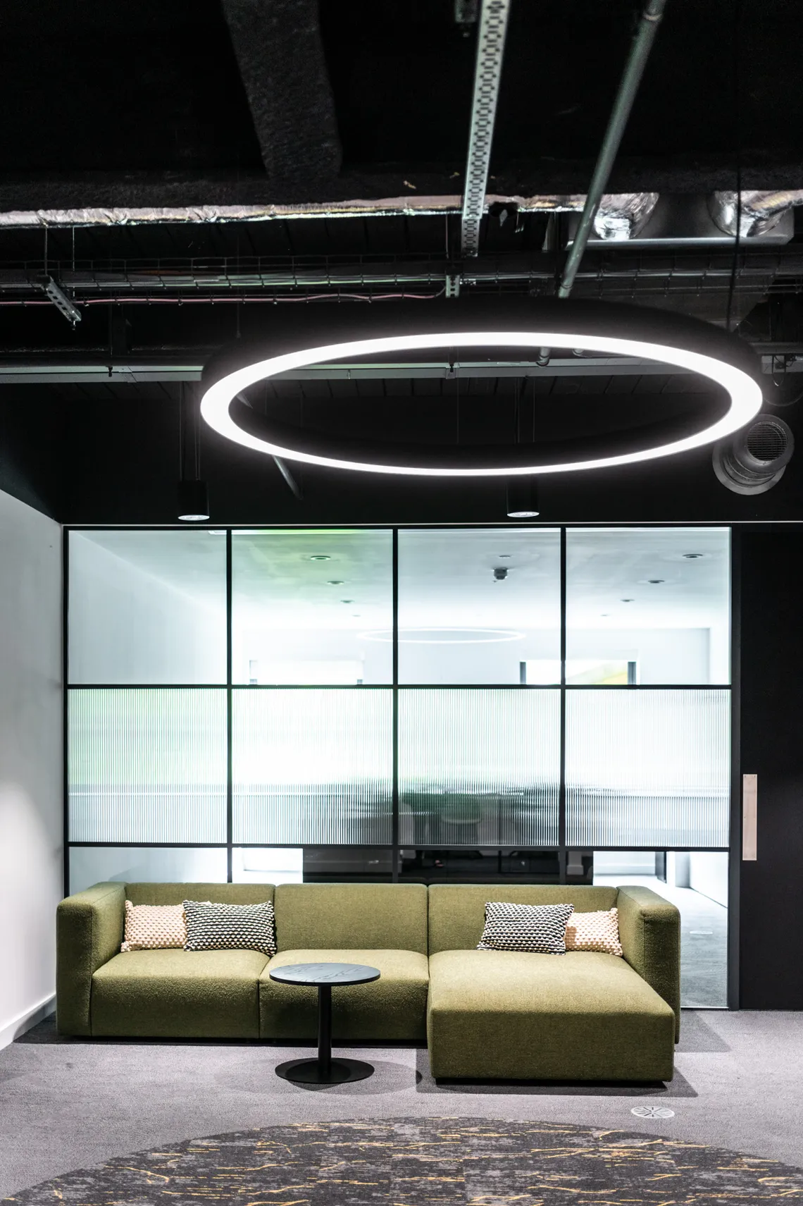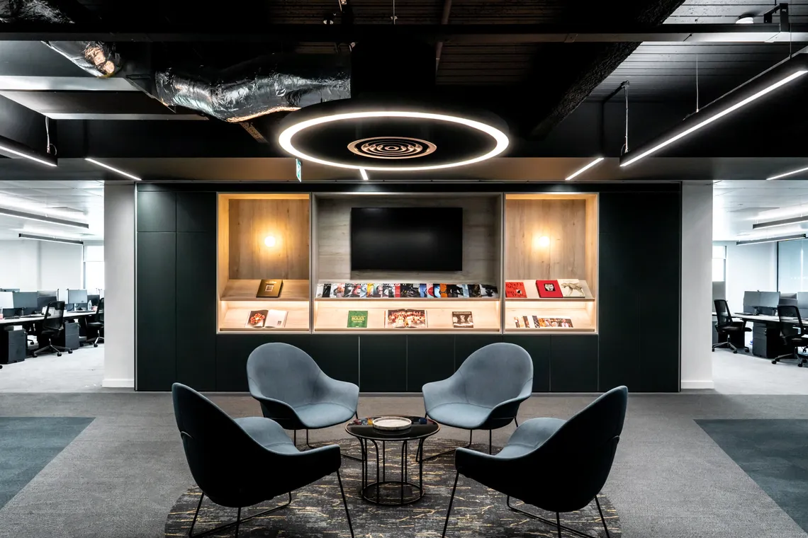 The design seamlessly incorporates numerous breakout spaces strategically positioned throughout the office, allowing employees to effortlessly disconnect from their work desks to collaborate with others. Each department in the building benefits from its own designated collaborative zone, such as bar areas for coffee and catch-ups, as well as semi-collaborative areas for scrum working and innovation, all equipped with digital screens, cosy furnishings, and curated libraries filled with inspirational books.