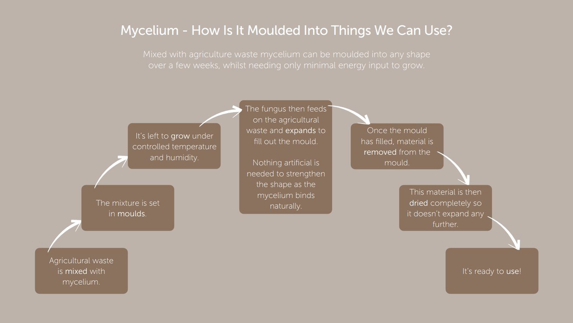 - A game-changer in sustainable innovation with reputable credentials! Created from two simple ingredients - local agricultural waste and mycelium, the Mycelium Panels boast a remarkable sound absorption across a wide range of frequencies, are entirely degradable and a natural fire-resistant barrier through a network of interwoven filaments.