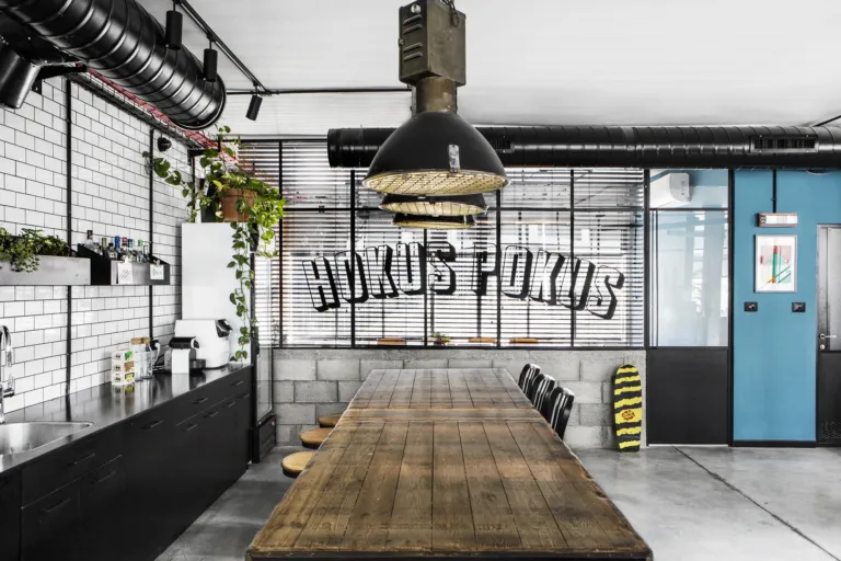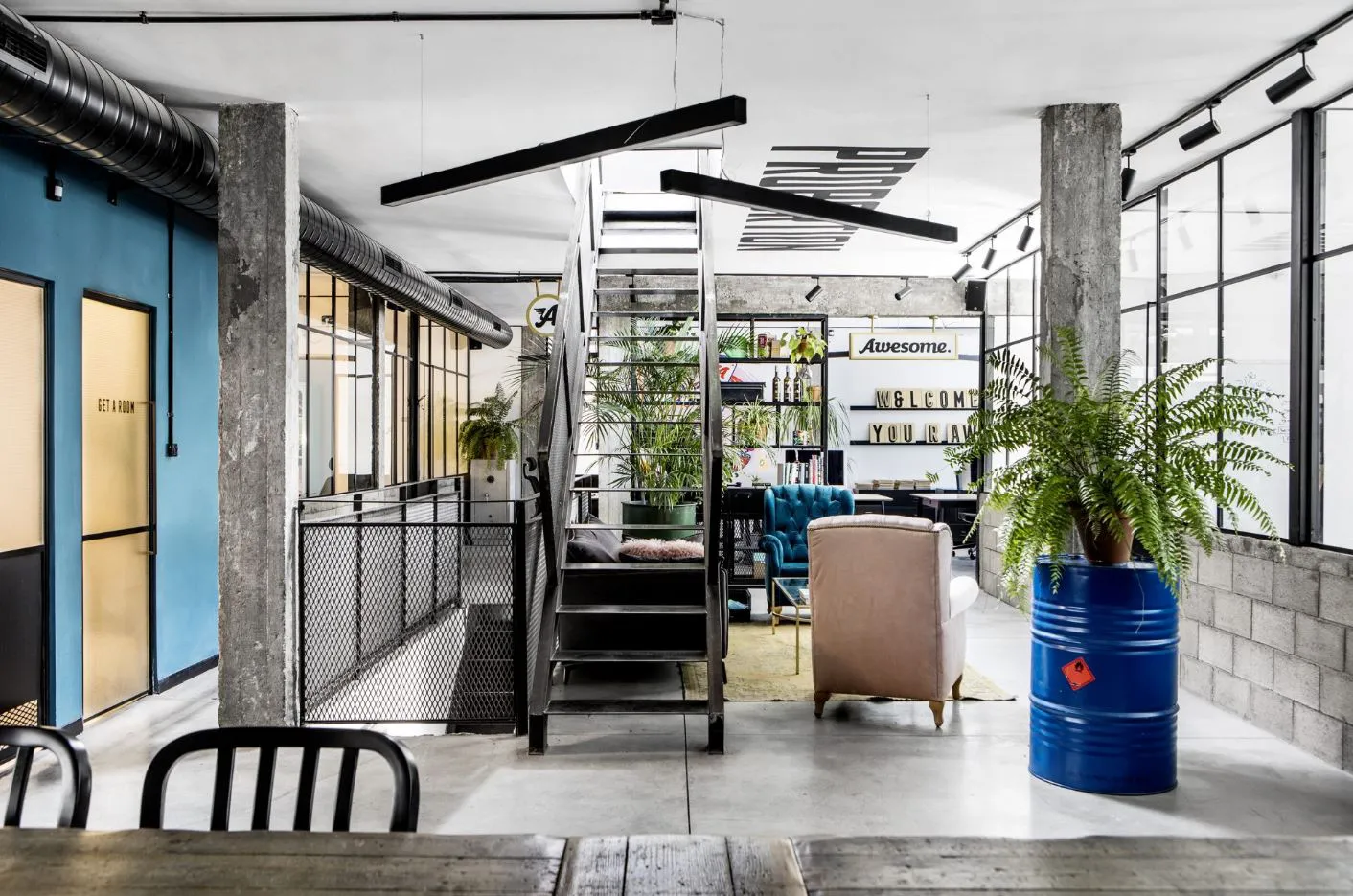 Electricity lines have been installed in exposed ducts through the space and exposed air-conditioning tubes, factory-style lighting features, plants in recycled steel barrels and a power wall constructed of wood scraps in the conference room complete the raw, industrial look.