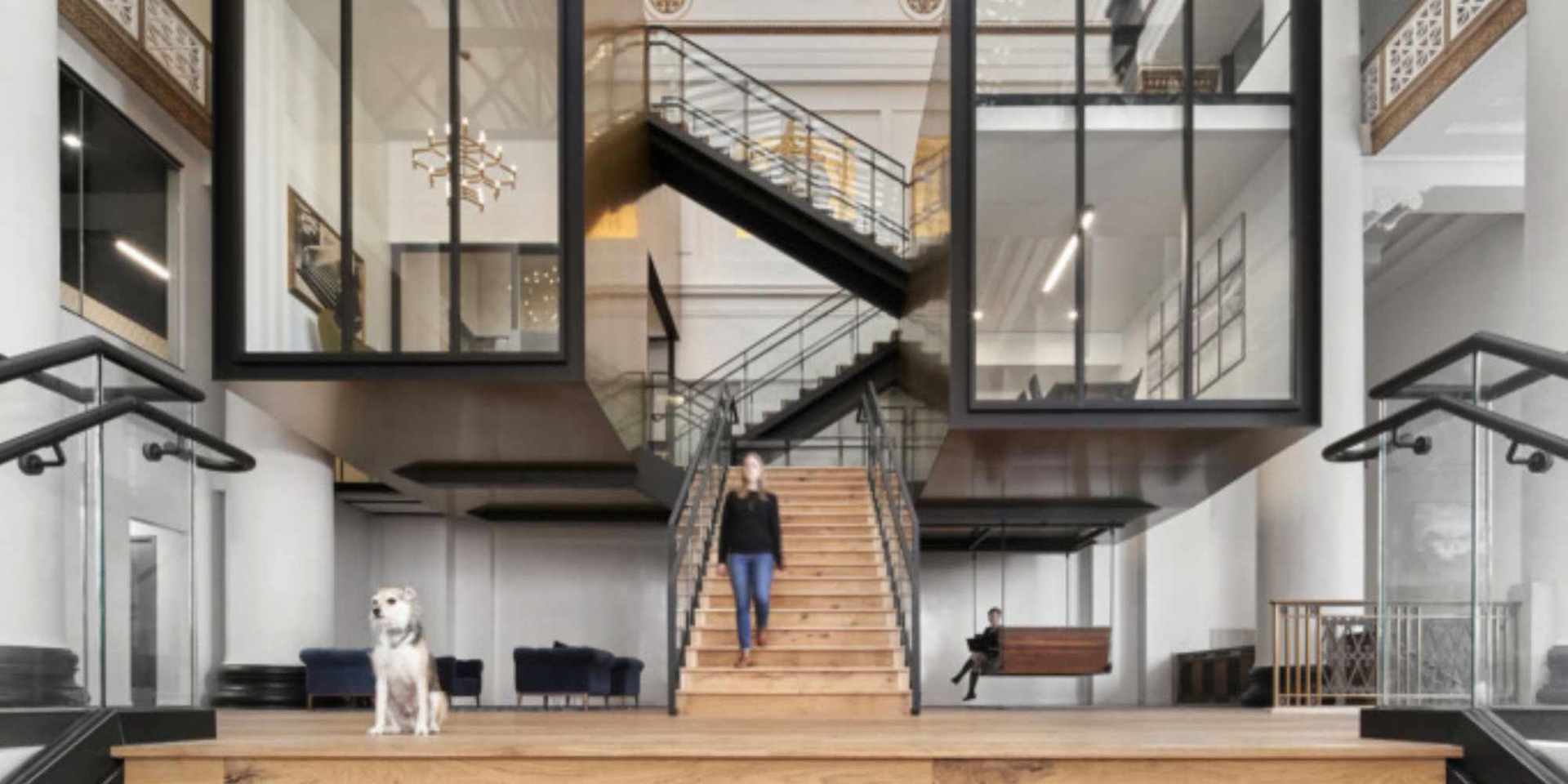 ZGF carefully balanced Expensify’s space needs and the historical importance of the building when designing a set of floating conference rooms located opposite and above the bank’s main entrance staircase by referencing the historical details and proportions.