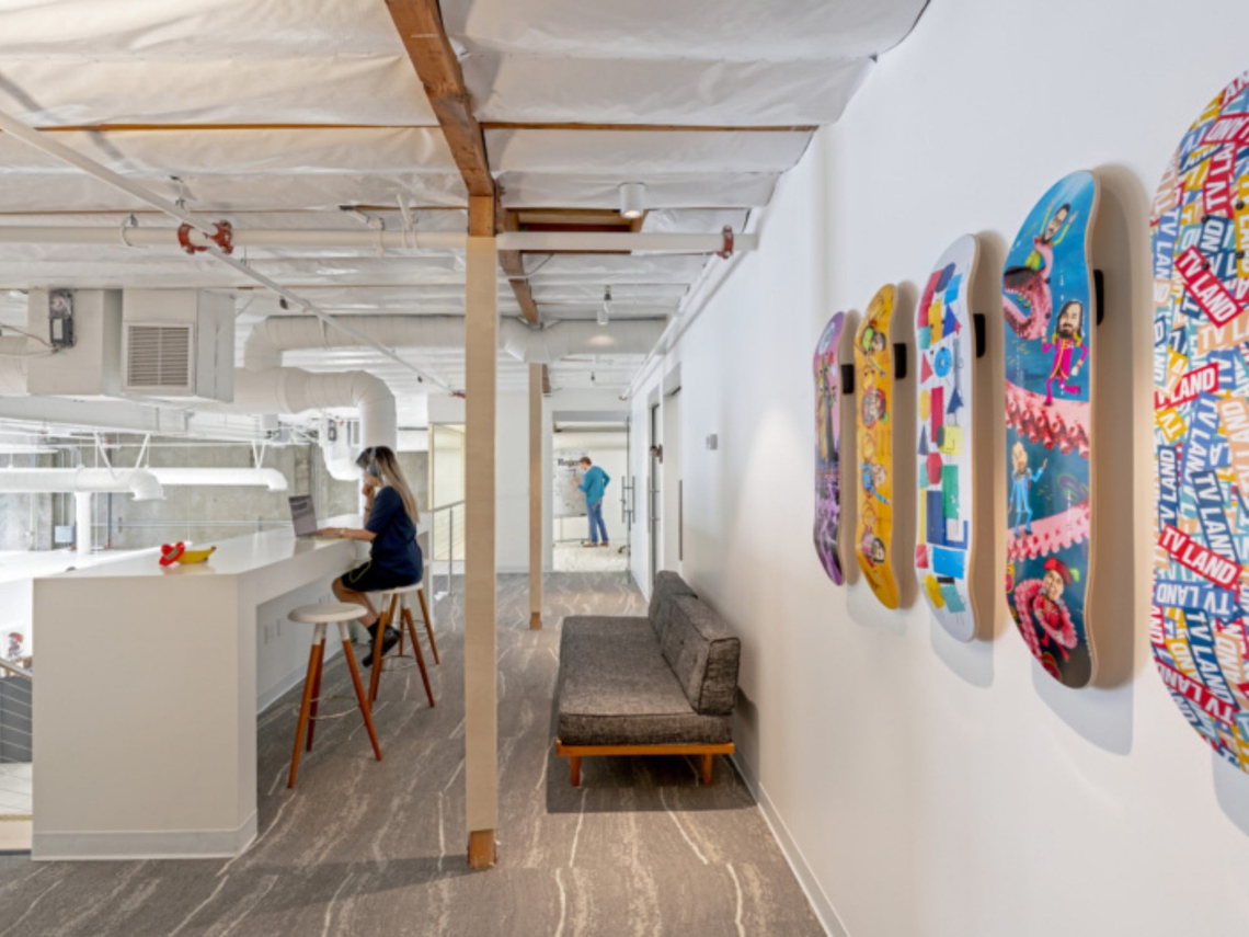 Adjacent to this area is a staging zone for photo shoots, and a green screen shoot mockup area. The mezzanine houses the post-production portion of the studio, including acoustic editing suites and recording areas. A ship ladder allows access to the rooftop and the restrooms are fitted out with accessible shower space, since many video creatives work nocturnal hours.