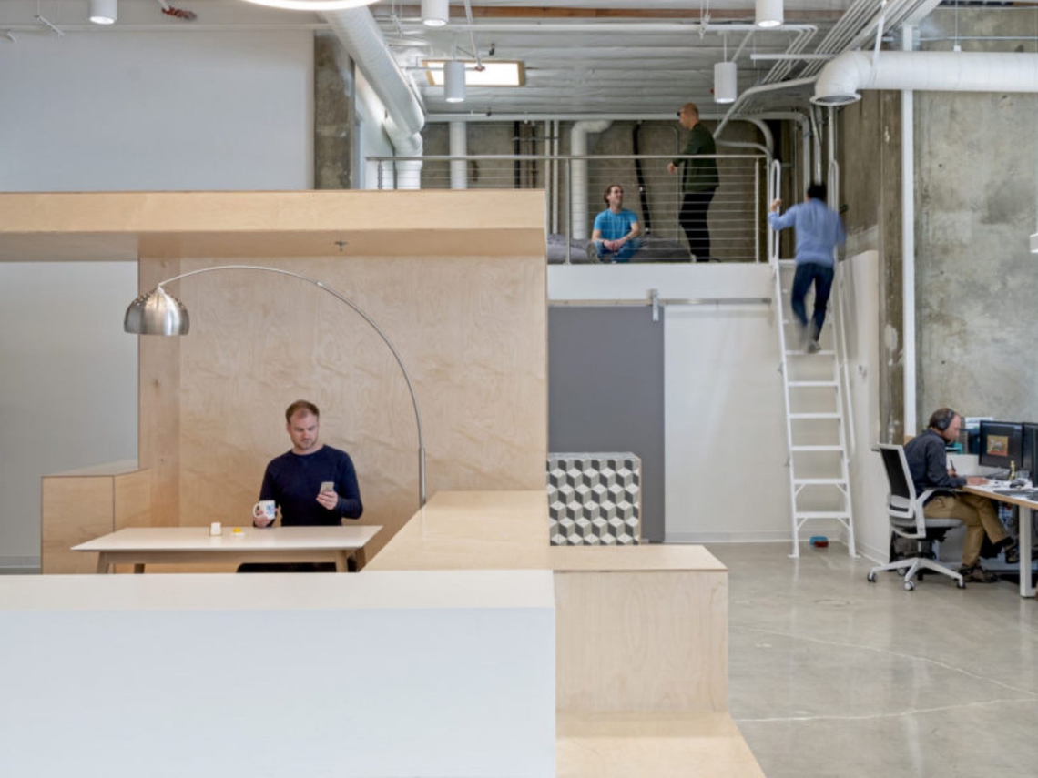 The design proposed a central area (nicknamed The Pit) for meeting, working, eating and lounging needs. The Pit is an orthogonal, multi-faceted armature and has been custom designed as an open shell with laminated plywood and light gauge framing. The surrounding loop houses a reception area, a lunch/work countertop that dovetails into a seating area, bleachers for visual artists facing the producers as well as a library and display shelving system. The area was located in the centre of the workspace to spatially divide private and public areas, and mediate both the horizontal and the vertical.