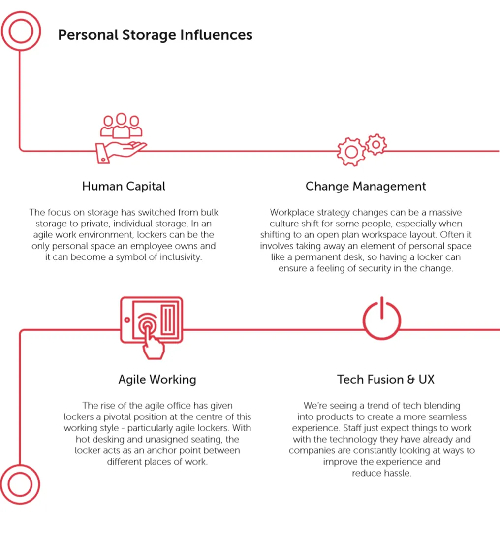 Over the last 6 years, the whole concept of office storage has gone through a major revolution. There is a major current shift from centralised archive storage to personal possession storage - from bulk filing to lockers. So we are seeing a re-positioning of the location and importance of the locker, shifting from back of house right into the hub of the work area.
