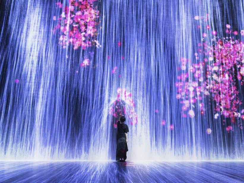 Une autre approche est envisagée par le collectif d'art numérique japonais TeamLab. En 2018, ils ont installé des tourbillons de lumière impressionnants dans la National Gallery du Victoria à Melbourne et pour le spectacle inaugural du musée Amos Rex à Helsinki. Au moyen de techniques de vidéo mapping et d'éclairage réactif, ils sont à même d'envoyer ce qui ressemble à de l'eau remonter les murs d'un bâtiment ou pénétrer dans le sol. Et, là aussi, au moyen de capteurs de mouvement, leurs installations peuvent réagir au passage des visiteurs à travers elles en temps réel. Le principe de TeamLab est de créer de magnifiques paysages numériques. D'autres projets récents ont inclus des chutes d'eau projetées, des mares avec des carpes koï et des forêts en mouvement remplie de floraison et de papillons qui voltigent autour du public.