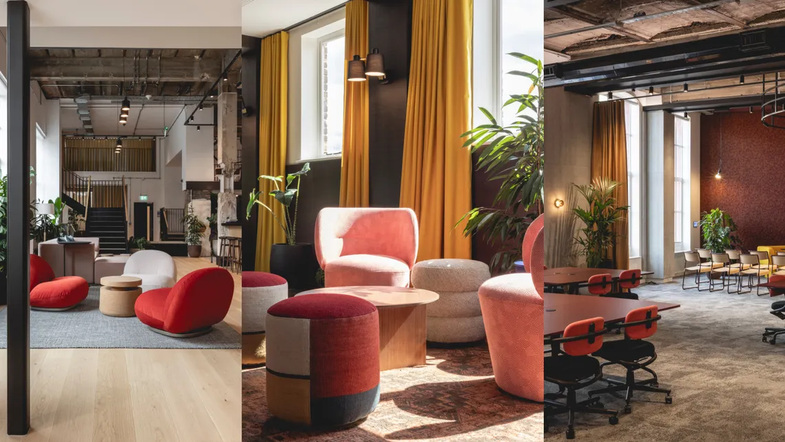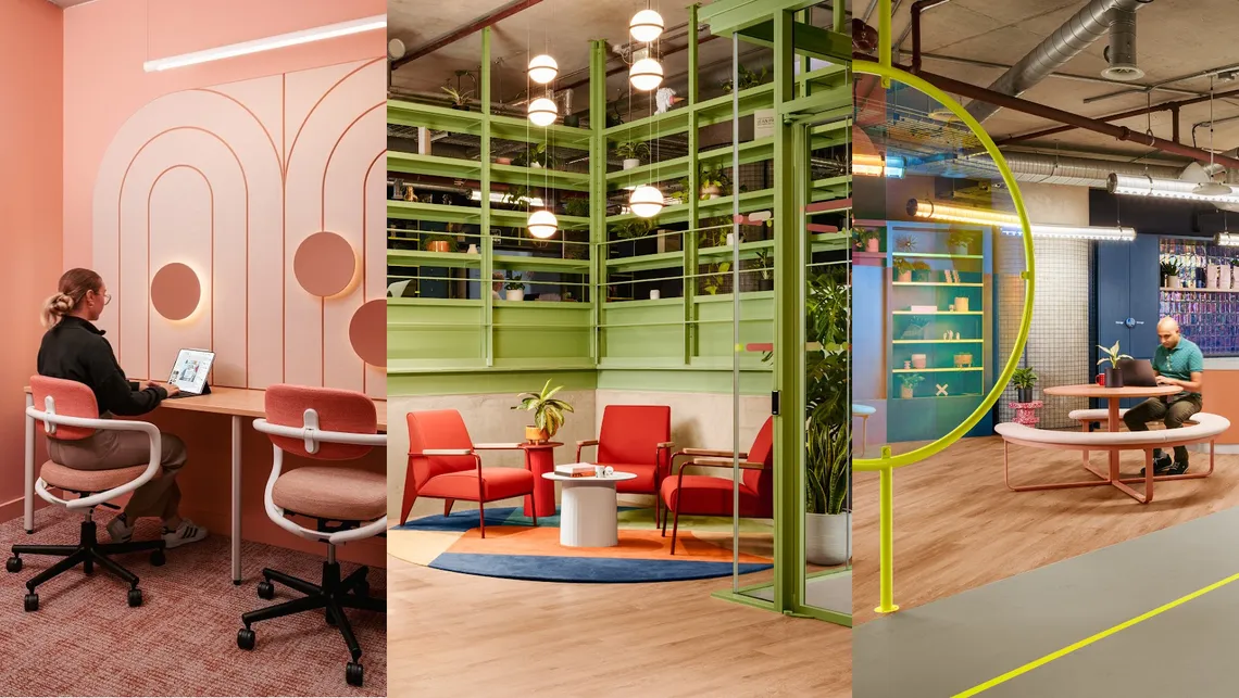 Maximalist brights—think fuchsia, electric blue, and lemon yellow—are reclaiming office spaces, energizing experiential zones and pop-ups.