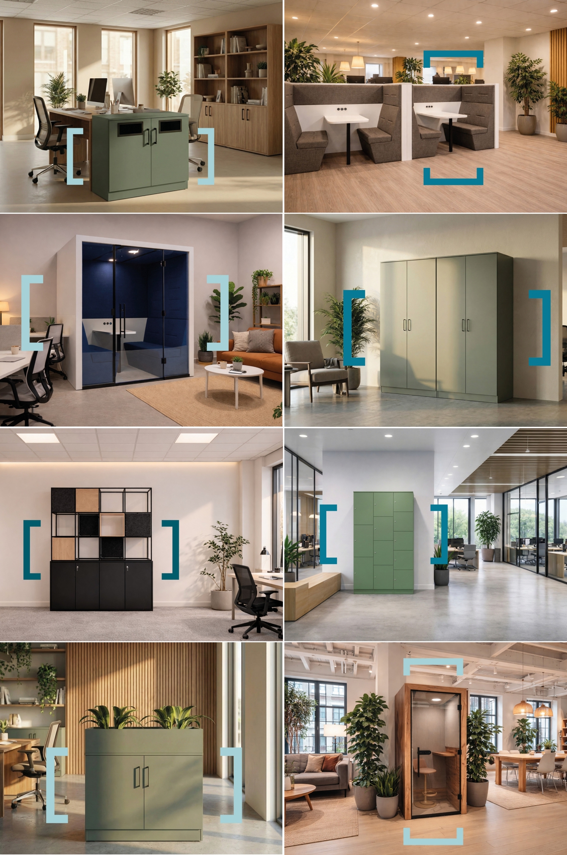 The products available in Spacestor [Edit] include a range of pods + booths, zoning, lockers and storage, shown below.