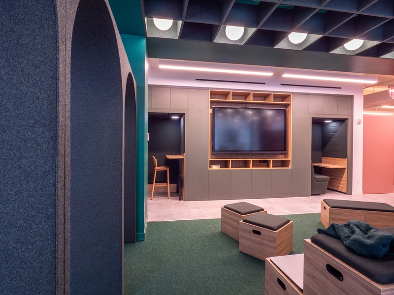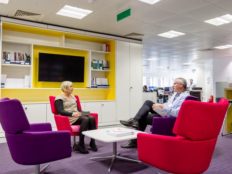 Un espace dynamique et créatif pour un travail d'équipe et de la collaboration dans les nouveaux bureaux de Active International, consultants en gestion d'entreprise.