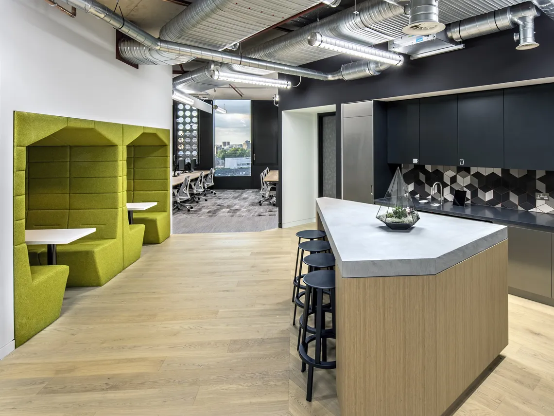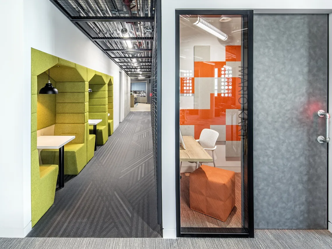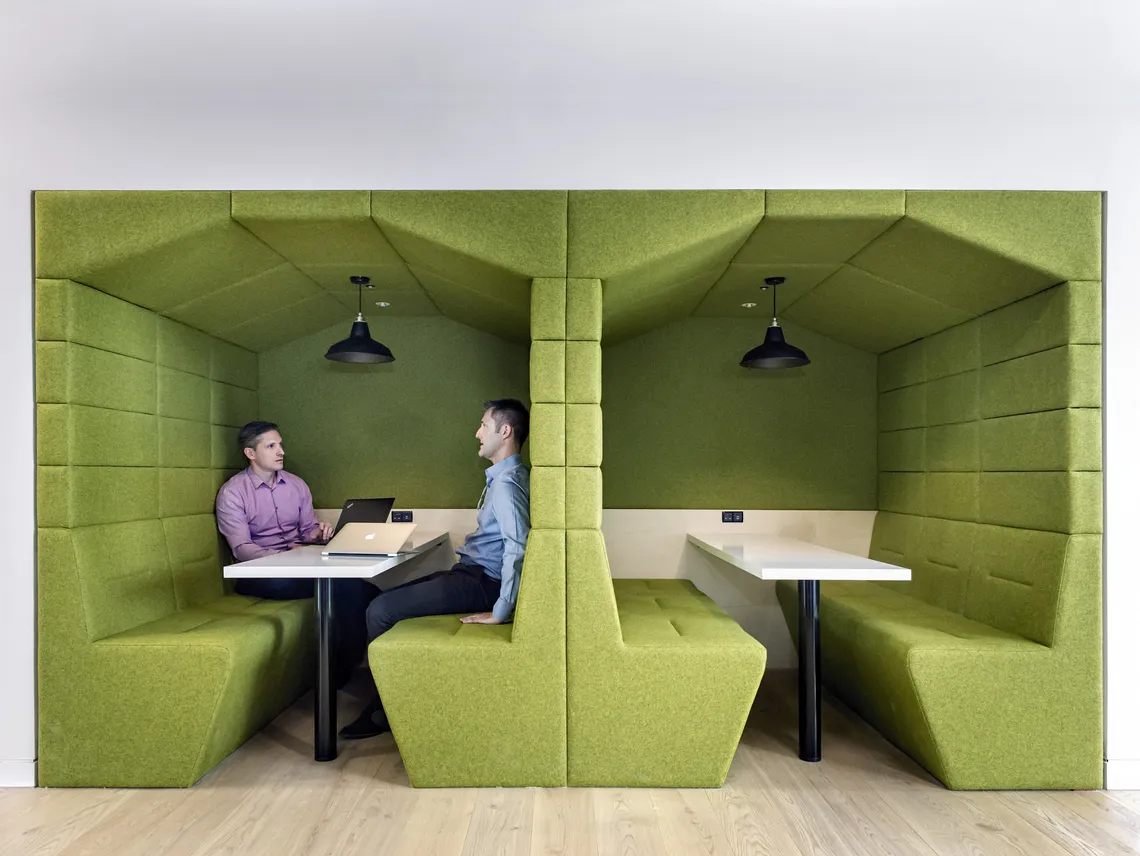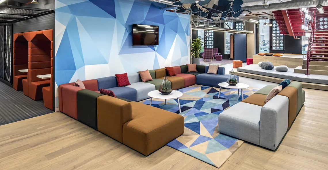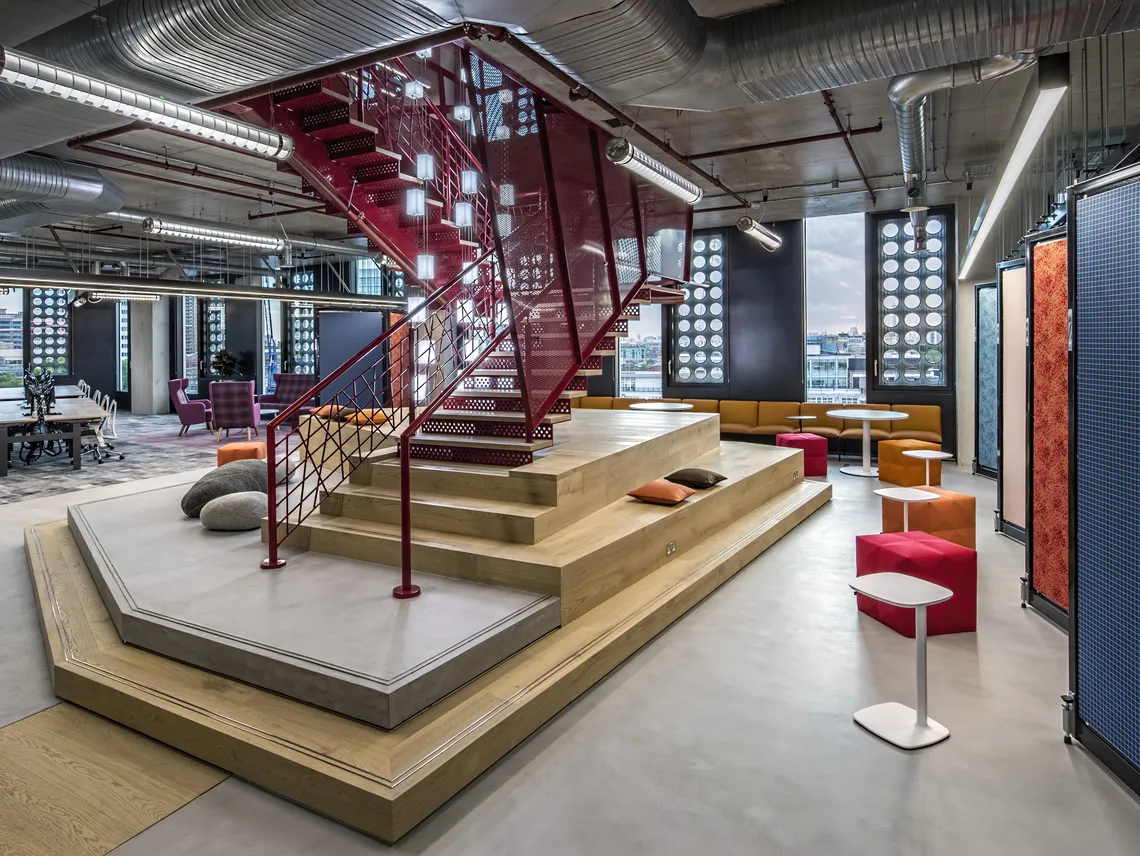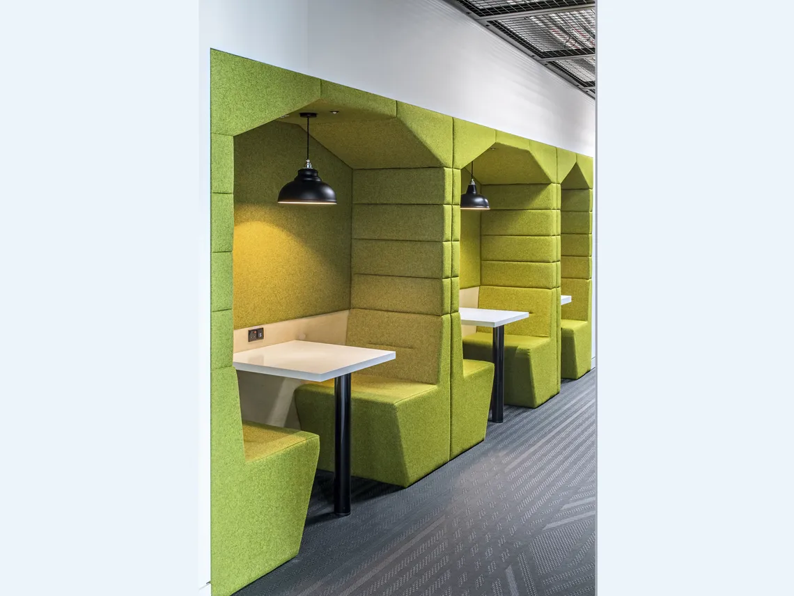 Ainsi, le 13ème niveau a été orienté vers le contact avec le client, le 8ème niveau a été orienté vers les services et le 7ème niveau a plus été transformé en un espace social avec table de ping-pong, jeux vidéo et de nombreuses zones polyvalentes de réunion. C'est là que nous avons installé quatre de nos plus populaires Railway Carriages en vert et rouge-orangé proposant des espaces plus calmes dans les bureaux entièrement en open-space pour des réunions et des conversations plus intimes. Nous avons le plaisir d'annoncer qu'elles ont eu un grand succès.