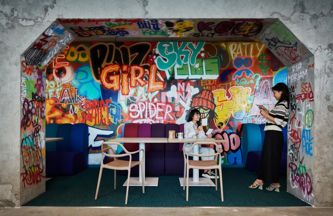 Rather than hiding behind a predictable tech aesthetic, the design embraces Atlanta’s eclectic culture and integrates this seamlessly with Autodesk’s workplace DNA. Layers of color, industrial detailing, and local artistry craft a space narrative - part urban playground, part natural refuge. Stadium-style seating for events, a breakroom modeled after Ponce City Market, and modular pods after the city’s famed “Tiny Doors ATL” all invite employees to work, collaborate, or retreat in spaces they can truly identify with.
