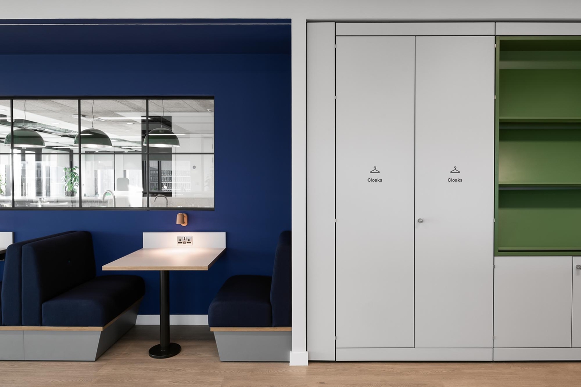 Based around a neutral and homely palette, the design also incorporates splashes of bold colour choices and full-wall graphics based on the outputs from the staff engagement sessions, giving the space an individual identity and a vibrant feel. As part of the vibrant bursts in the office, our HotLocker product provides fully customized, personal storage in several configurations throughout the space. Adjacent to one of the breakout zones, a run of colourful lockers reflects the colours of the bold graphic behind. Not only are the colours beautiful, but they make it easier for employees to remember which is their locker. Elsewhere in the space, the lockers have been built-in alongside our Storagewall to give a totally bespoke look and feel, whilst still retaining the benefits of a fully modular system.