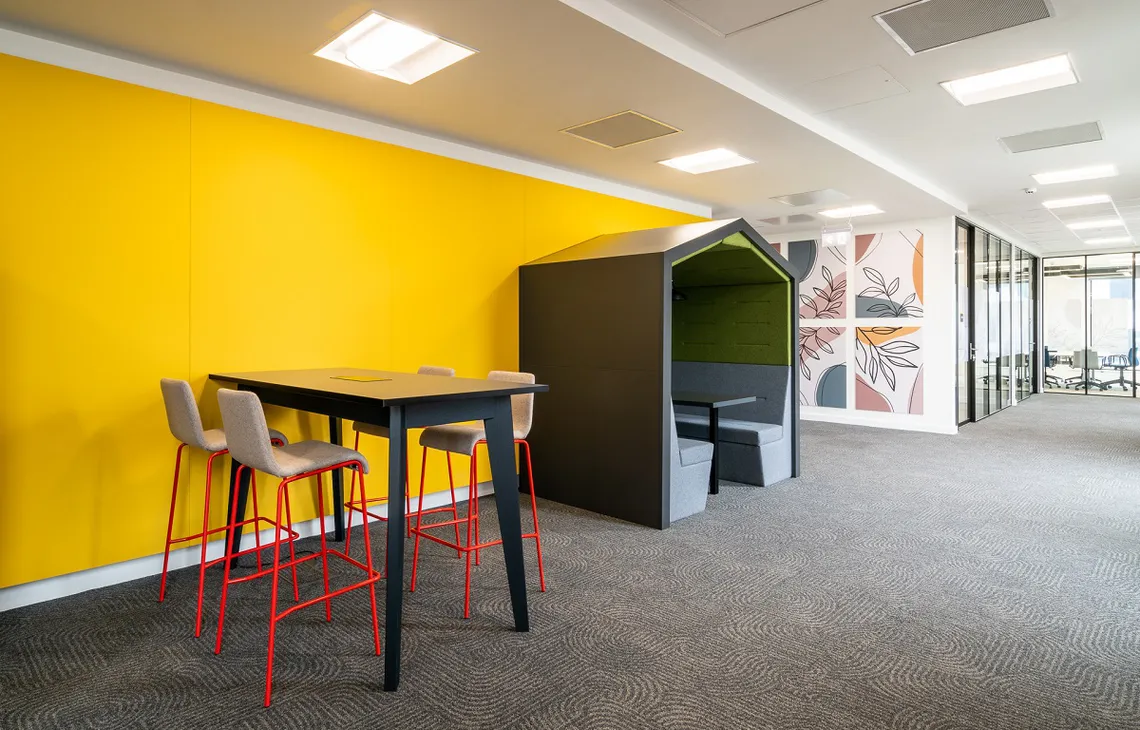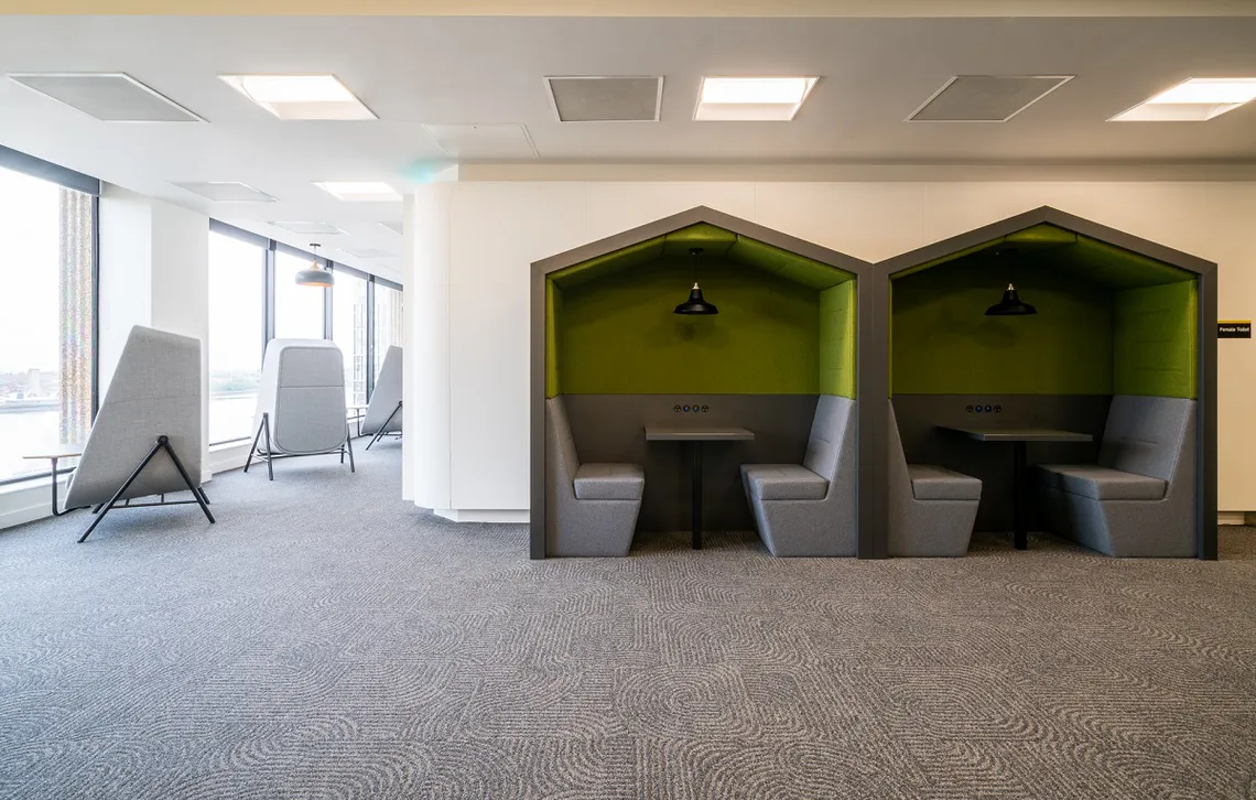 On a optimistic, energising backdrop of yellow, Railway Carriages in a stately green and grey, populate the space, providing employees with sites for impromptu meetings and catch ups. This is something which is critically necessary in the back-to-work era when face-to-face social interaction is experiencing a resurgence. Employees need to experience the benefits of being back in the office and undoubtably, networking, and social relationships are a major factor in creating a culture which has people returning again and again.