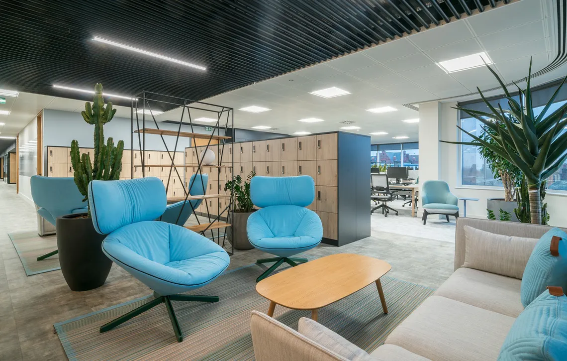 Employee experience is enriched further with a personal storage solution which runs alongside agile working. Banks of Lockers are an extension of the D&G brand, highlighting a soft natural look, a calm environment which attracts and retains talent. Textures and colours are understated, but bursts of colour add inspiration and stimulate creative thought. Strongly linked to the sympathetic design is the natural light and biophilia which uplifts mood and assists crucially with employee wellbeing.