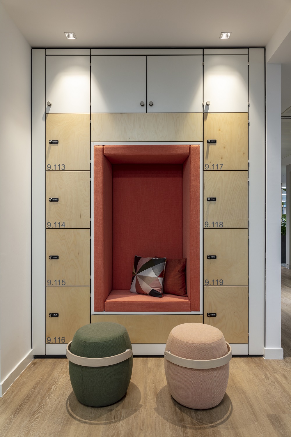 Set in the heart of London, the new workspace is spread out over 24,000 square feet and provides a plethora of different space types including a formal reception, breakout areas, a sophisticated bar, bench desking, quiet seating nooks and personal storage. Working with BW Interiors at Cat A and Operandum at Cat B, we were pleased to supply several of our solutions to the space. Throughout the space, several different banks of our lockers give employees their own personal storage area within the workspace. Tying in with the biophilic looks and feel, the lockers have been designed in organic greens and plywood finishes to complement the raw and natural feel of the space.