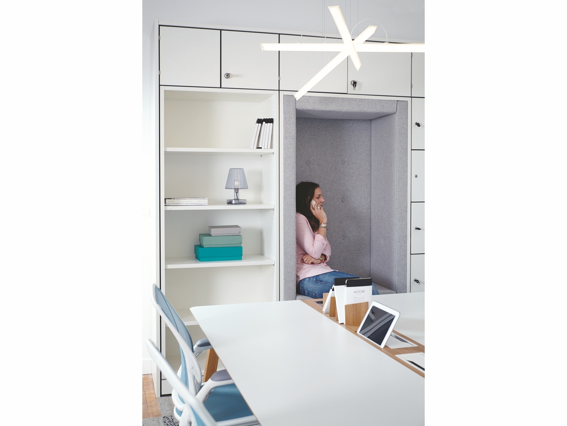 Pour renforcer ce concept de travail collaboratif, nous avons installé une Railway Carriage avec toit incliné et sans panneau arrière offrant un endroit où les employés peuvent tenir des réunions informelles et partager des idées. Les cabines ont été personnalisées pour correspondre à l'aspect minimaliste de la marque. Nous avons aussi augmenté l'espace de stockage dans les bureaux avec le Storagewall de Spacestor et un Snugglestor intégré dans le mur, créant un perchoir social pour le bénéfice du personnel.