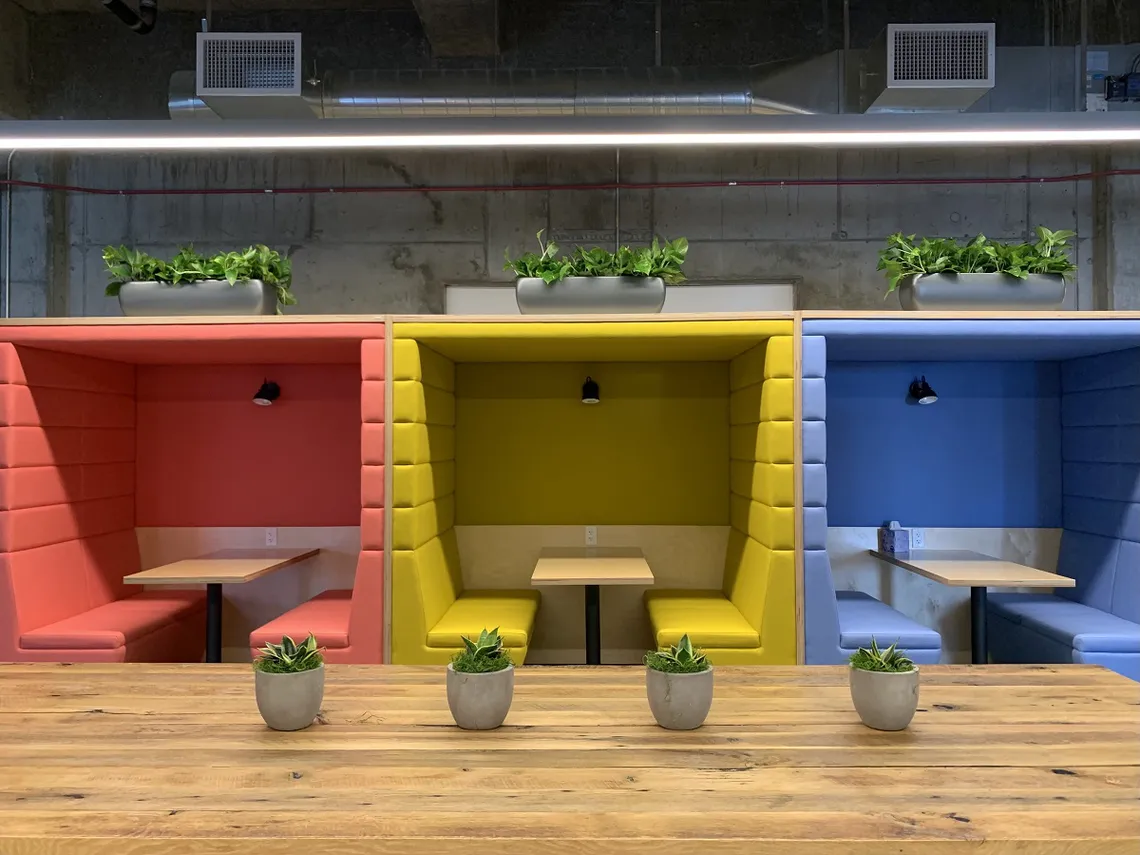 For their downtown San Francisco HQ, LOB asked innovative workplace designer, Kelly Robinson, to create a brand new look for their collaboration and open office spaces. Focusing on bringing the full spectrum of color into the design, we worked with furniture dealer Pferred to provide six of our Railway Carriage office booths in a soft palette of muted upholstery tones, complimented by the biophilic look of the lacquered plywood cladding.