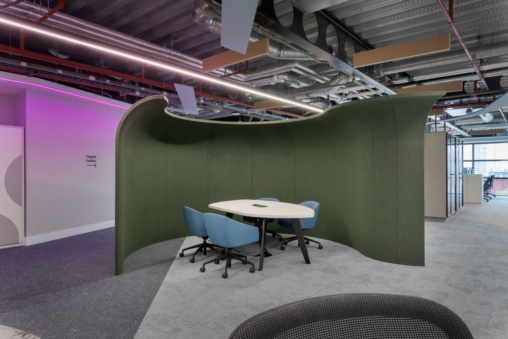 Organic curves and arches help to soften and zone the vast floorplate. They appear on the flooring, lighting, free-standing furniture, and meeting spaces and have even been used to create an arched welcome for employees. Spacestor provided the arches and curved collaborative space with Aeonica, their modular toolkit for the workplace.