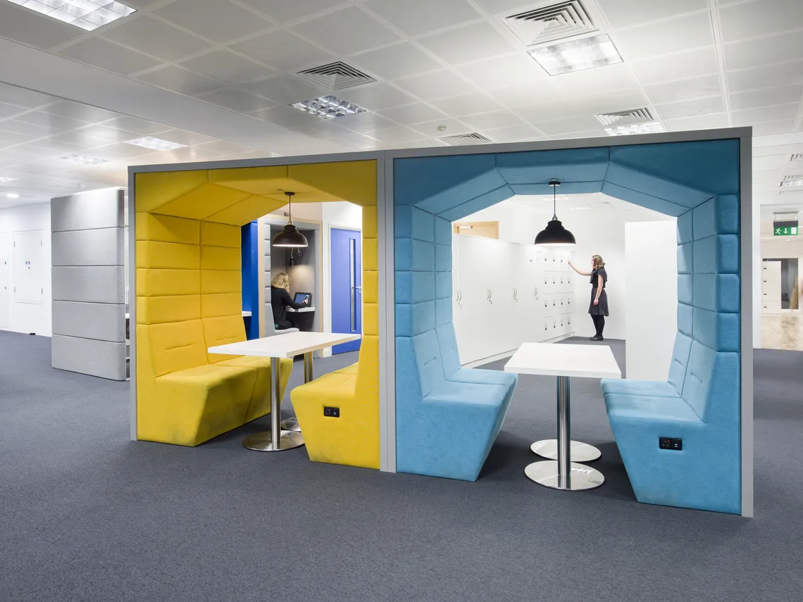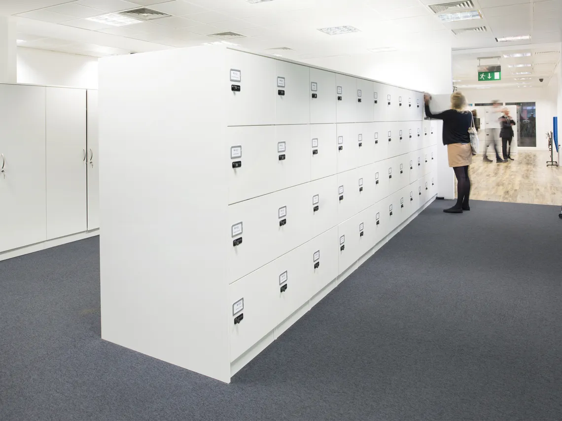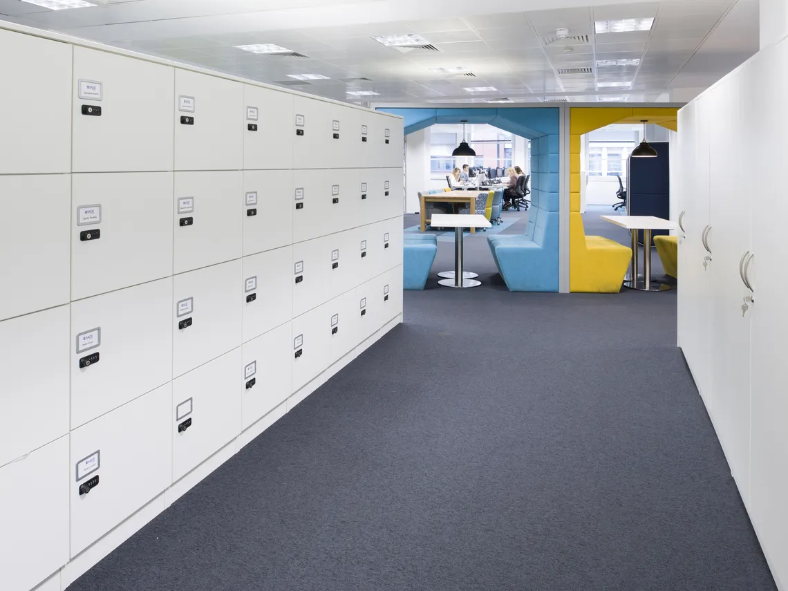 Nous avons installé des Railway carriages deux places et des Phonebooths une place pour créer des espaces de travail intimes et réservés offrant une tranquillité supplémentaire et permettant la concentration, des HotLockers pour que le personnel stocke ses affaires alors qu'ils se déplace dans les bureaux et une variété d'étagères et de modules de stockage qui permettent de conserver des bureaux aérés, rangés et clairs.