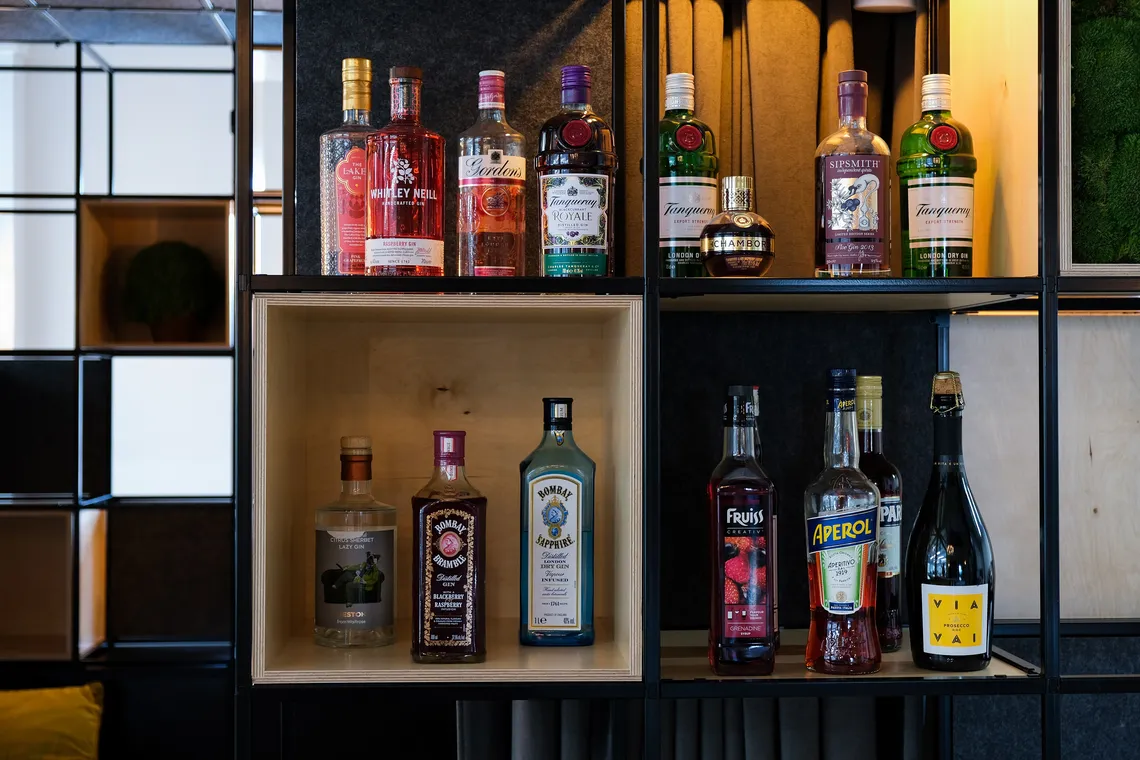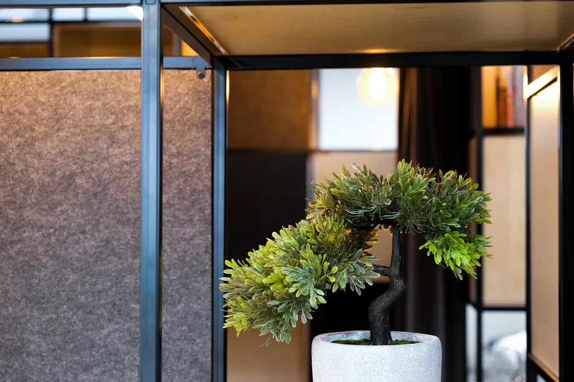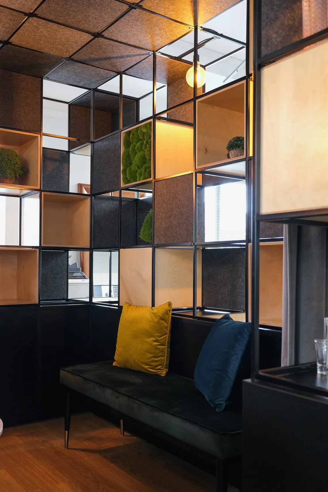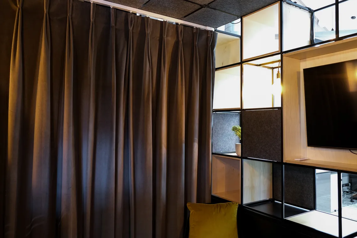 As part of their workplace redesign, Scott Osborn chose our Palisades II to create an inspirational semi-private, meeting space! Palisades II offers a new way to divide spaces and create different zones, in a light and minimalist way. Creating an architecture within an architecture, the configuration provides space for a meeting within the room and shelving for the bar on the outside! As part of the hugely flexible Palisades II system, this configuration includes a 2d ceiling, a plethora of acoustic panels, hanging lights and curtains to create a cosy aura and a luxe backdrop for the bar.
