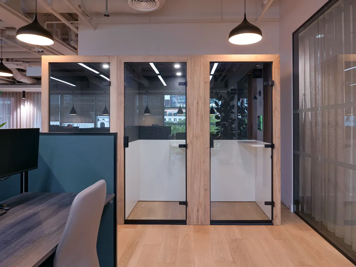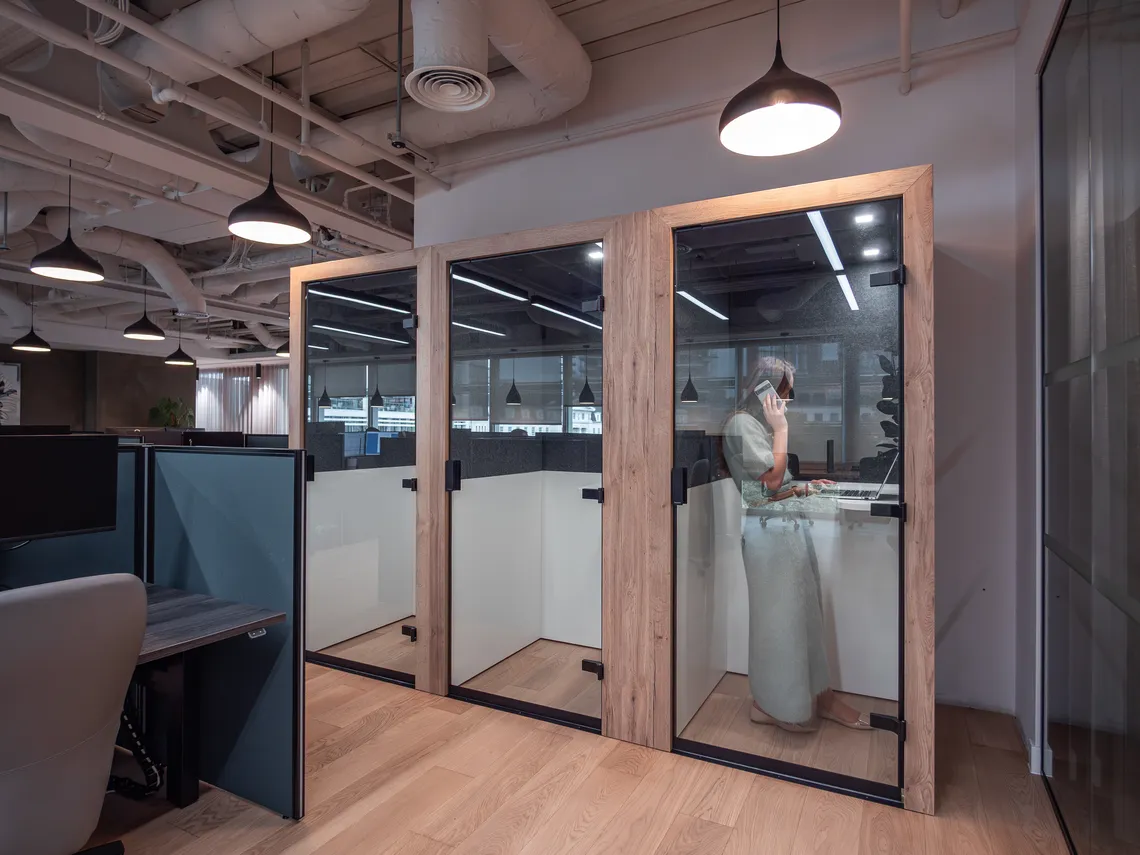 The Portico pods were chosen after careful considerations, for their customizability, size, and easy installation. The pods were specified in a woodgrain finish, which blends in well with the overall aesthetic of the space, and feels a natural part of the design. The size of the Portico means that it feels spacious enough inside, whilst also having a small enough floorplate that there was room for 3 of the pods along a previously disused wall.
