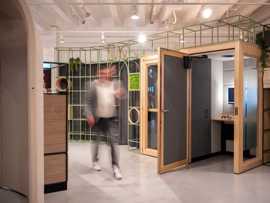 As part of Spacestor’s Palisades II range accessories are available which allow great design choice and can be used innovatively to ensure every configuration is unique. Archways, curtains, and biophilic elements introduce soft lines and acoustic protection, promoting a serene and focused atmosphere. Meanwhile, TV alcoves, shelving, and storage options cater to the functional needs of any workspace. The result is a statement architecture that combines aesthetic appeal with practicality.