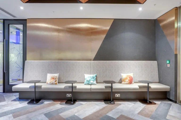 In addition, a natural circuit (for when times demand) is created by the atrium and in the open plan area with two walkways demarcated by pink and green geometric carpeting, allowing staff to get some steps in.